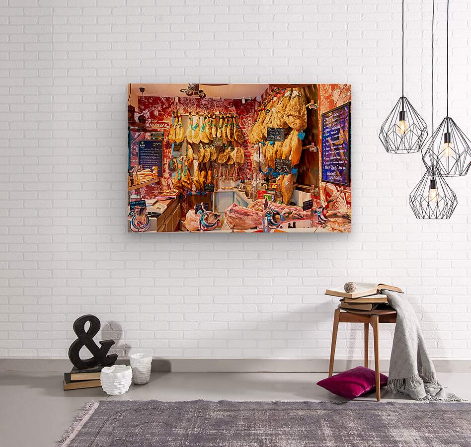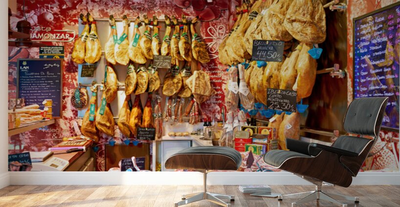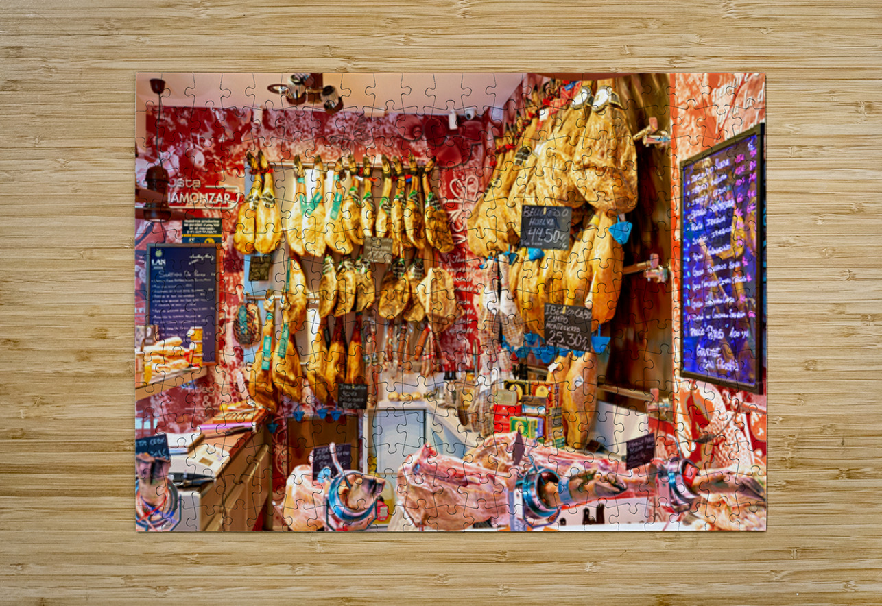 Visitors explore a shop in Granada Spain featuring Jamon Iberico bellota pata negra hanging on display.