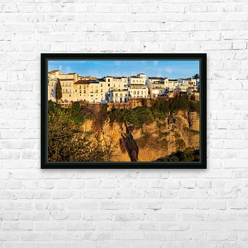 Ronda sits on the edge of El Tajo gorge in Andalusia during sunset. Buildings overlook the cliff and show the landscapes beauty.