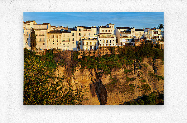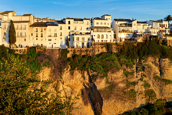 Ronda sits on the edge of El Tajo gorge in Andalusia during sunset. Buildings overlook the cliff and show the landscapes beauty.