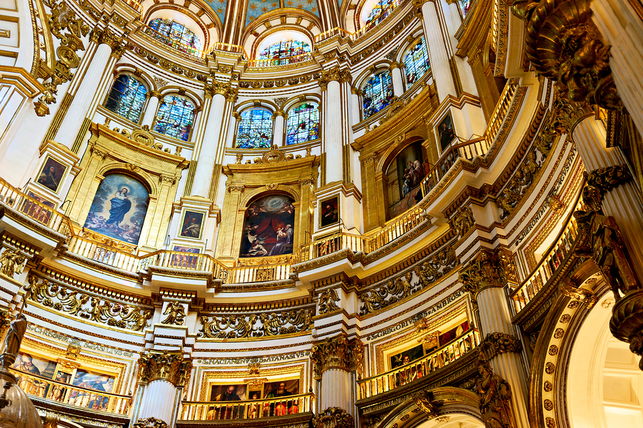 Visitors admire the detailed architecture and artwork inside the Capilla Mayor in Granada Cathedral Andalusia during a sunny afternoon.