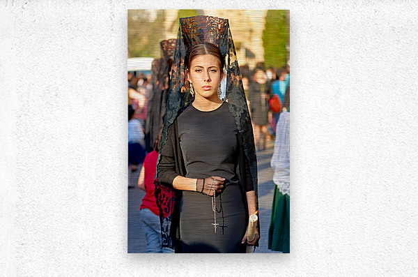 People take part in Easter Holy Week processions in Granada Spain. A woman holds a candle and wears traditional clothing during the event.