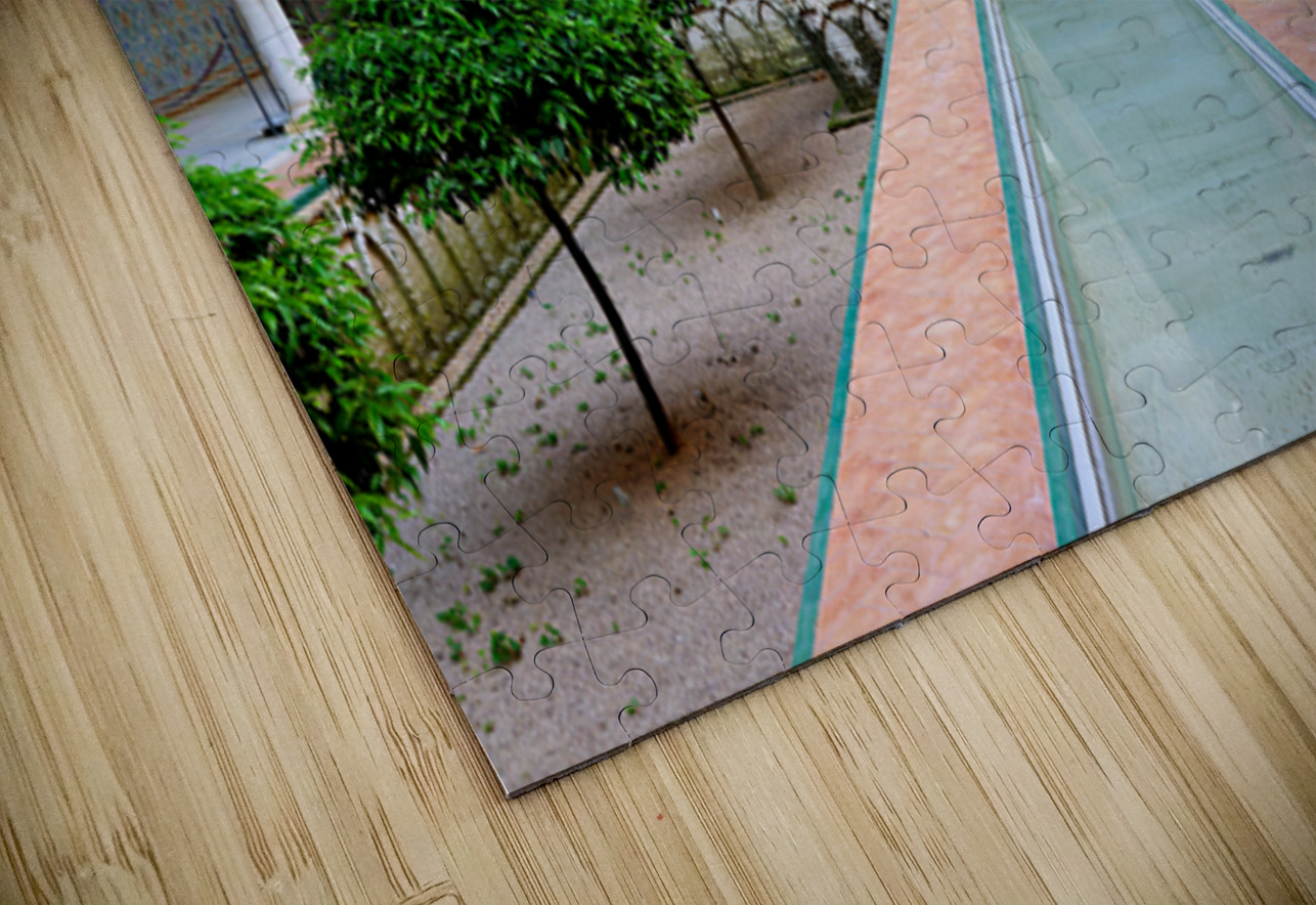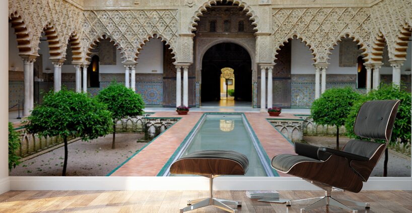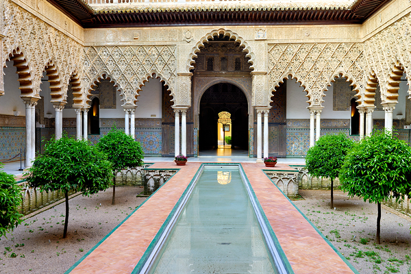 People explore the historic Alcazar in Seville Andalusia Spain. The courtyard features trees columns and a reflective water path.