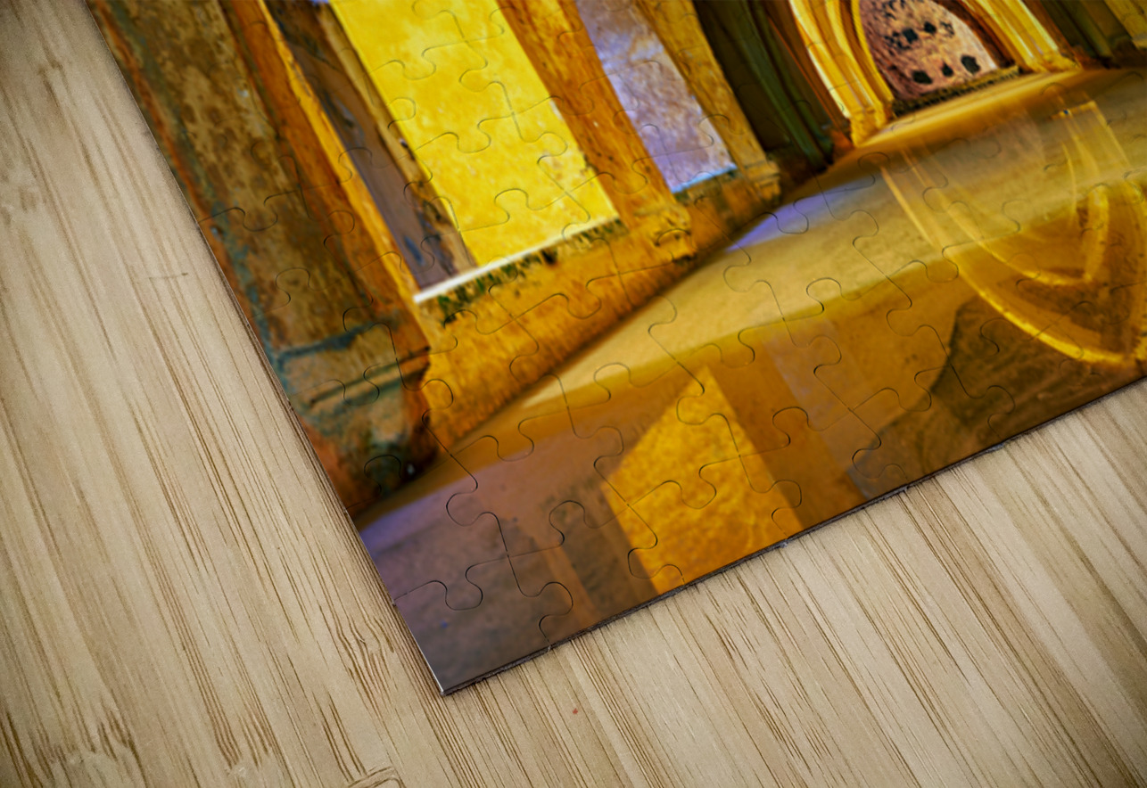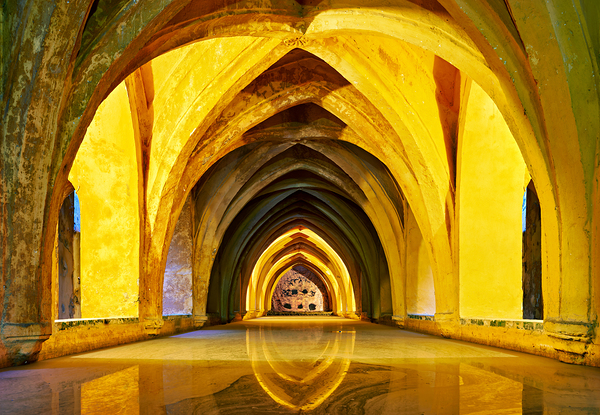Visitors explore the unique arches and warm lights of the Alcazar in Seville Spain during a sunny afternoon reflecting the history of the site.