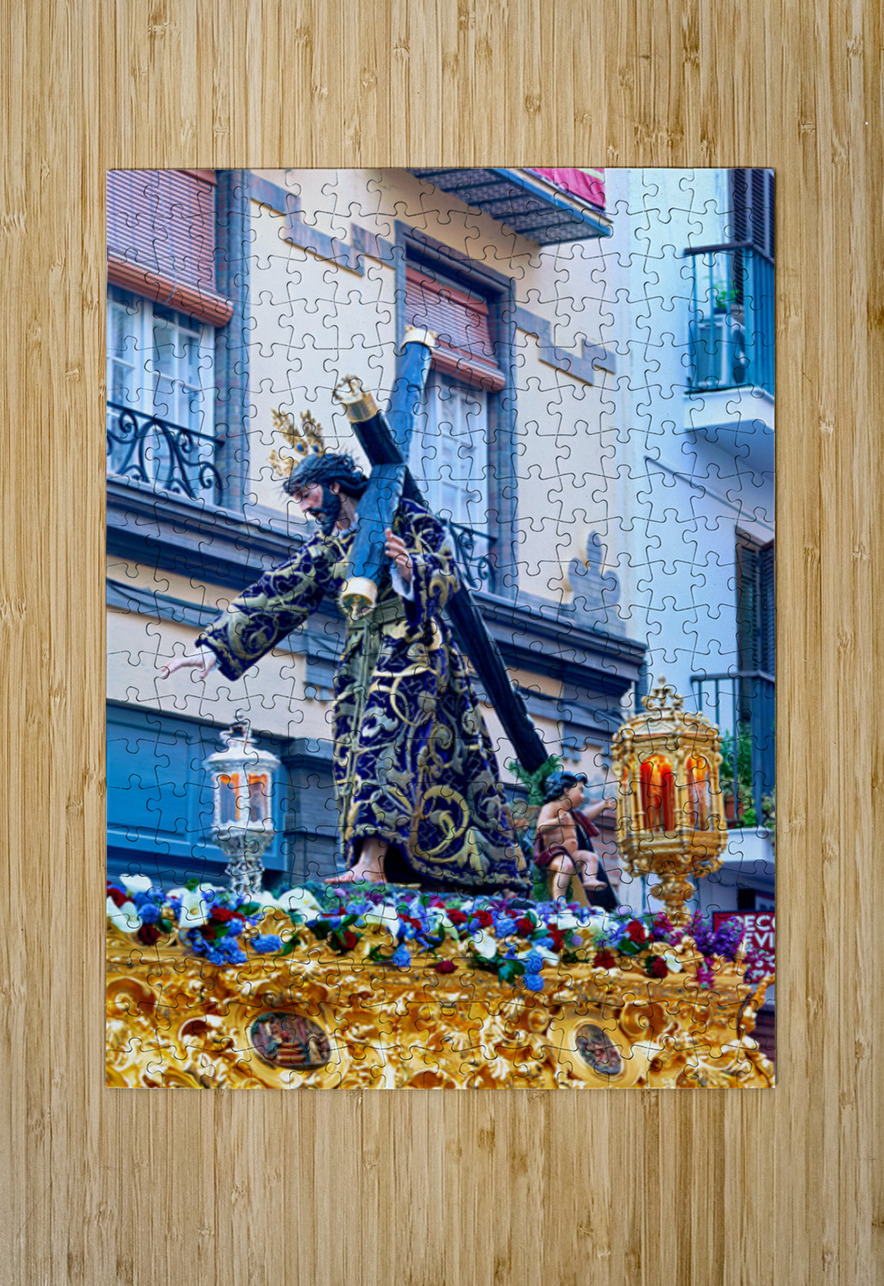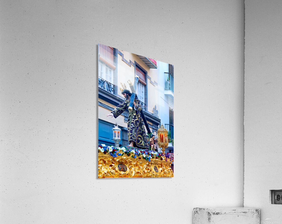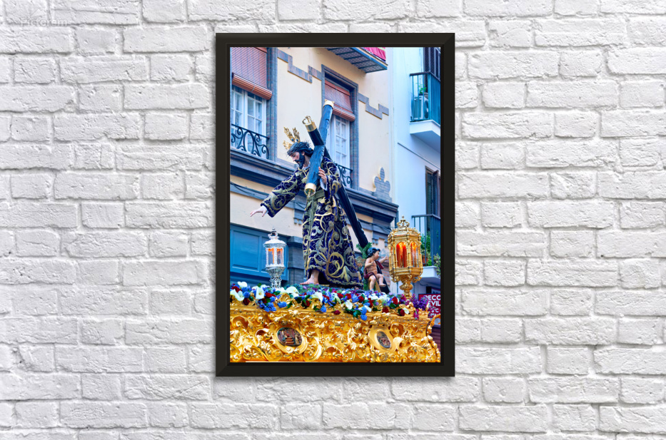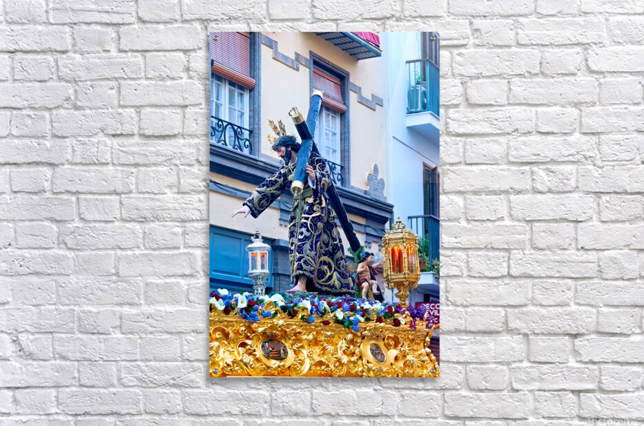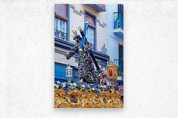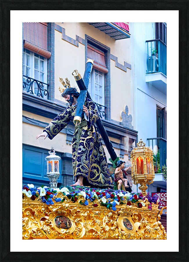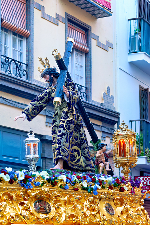 Crowds gather to watch the Easter procession in Seville as a statue of Jesus carrying the cross is displayed on a decorated float.