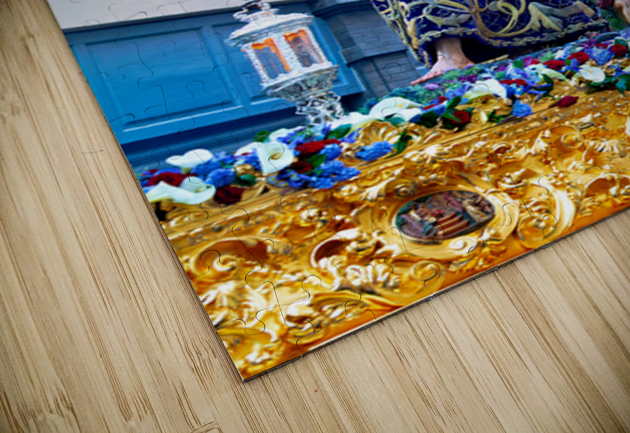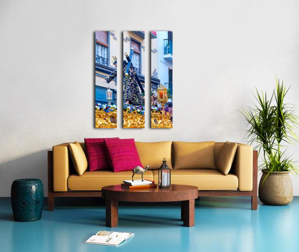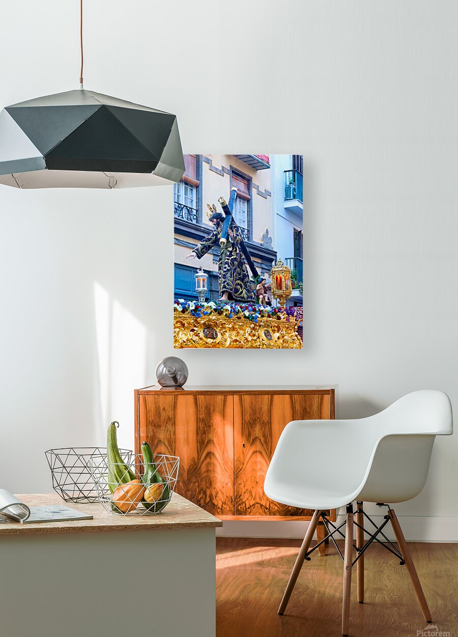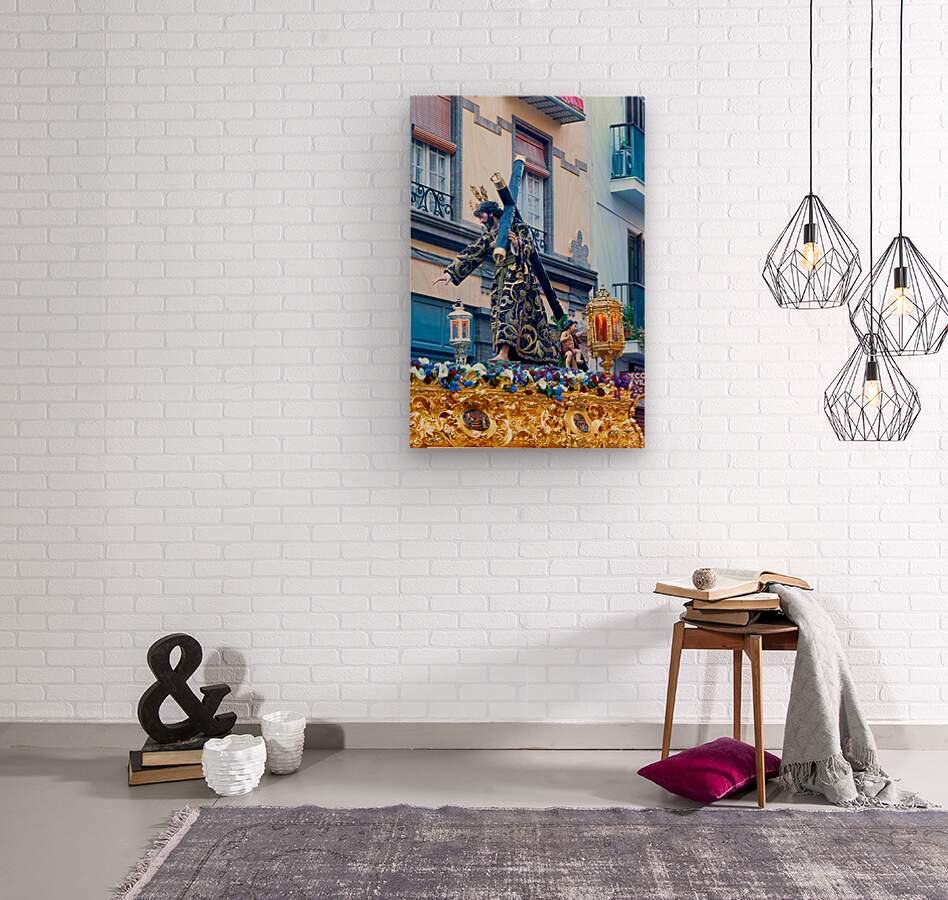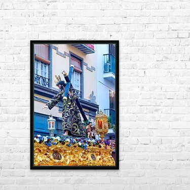 Crowds gather to watch the Easter procession in Seville as a statue of Jesus carrying the cross is displayed on a decorated float.