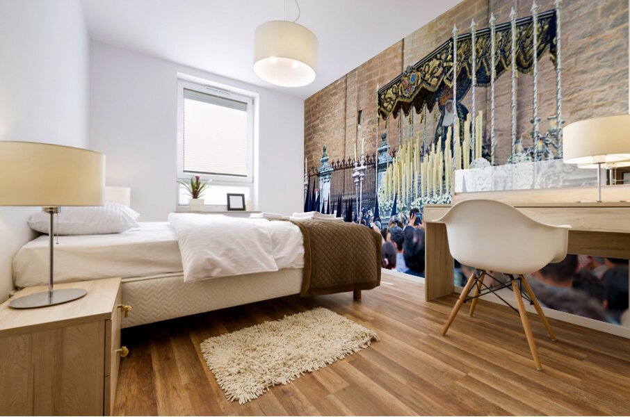 People gather in Seville for the Easter Holy Week processions. A decorated float moves through the streets with candles and flowers.