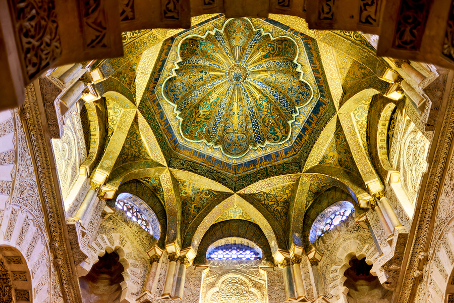 Visitors look up at the decorated ceiling of the Mezquita. This historic site in Cordoba attracts many tourists every day.