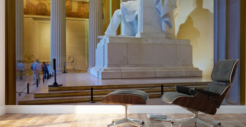 The statue of Abraham Lincoln sits inside the Lincoln Memorial in Washington DC. Visitors admire the structure and reflect on its history.