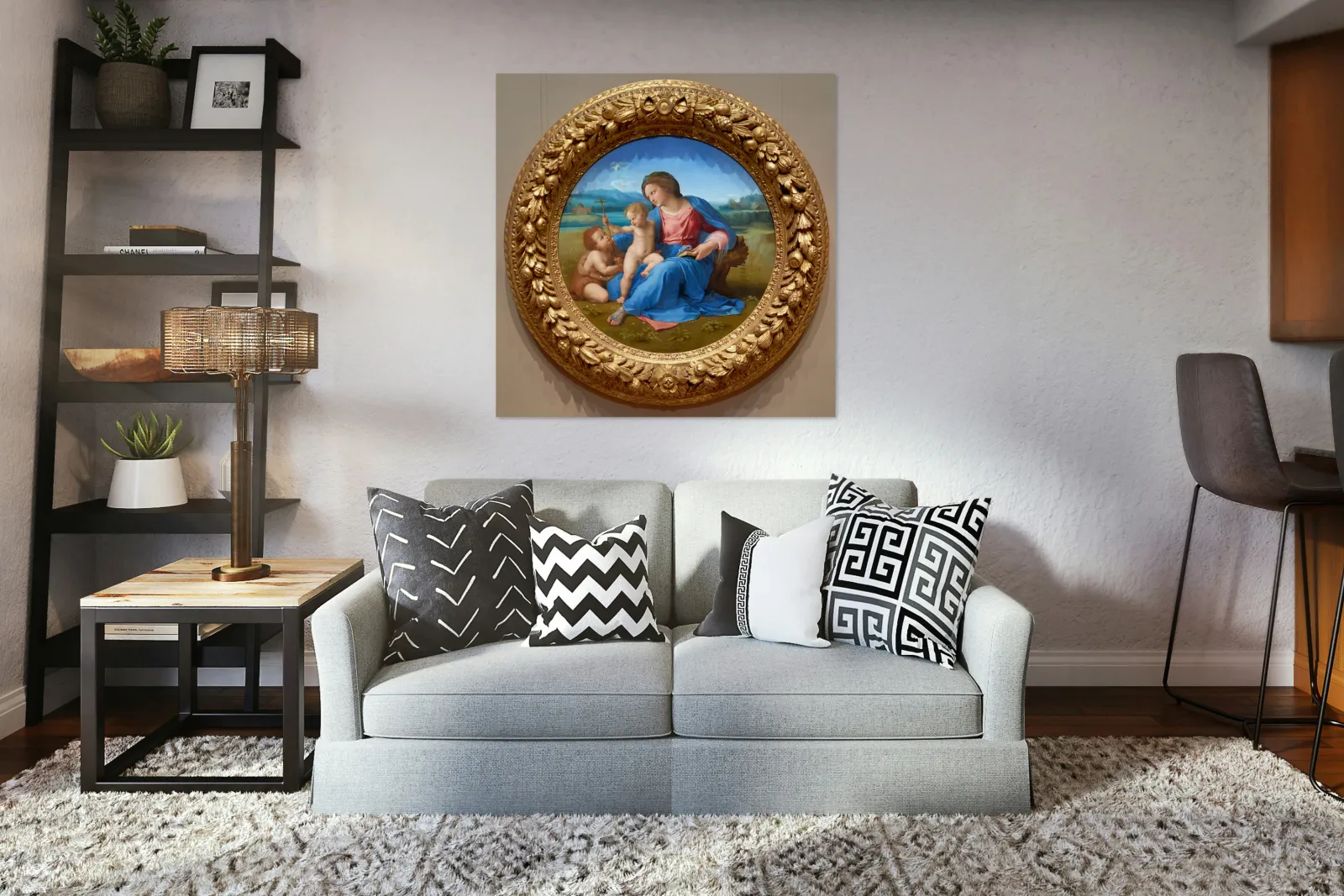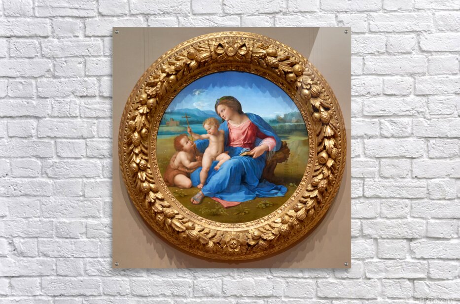 Raphael. Mary with the child Jesus and John the Baptist. They sit outdoors with hills in the background. The setting is bright and lively.