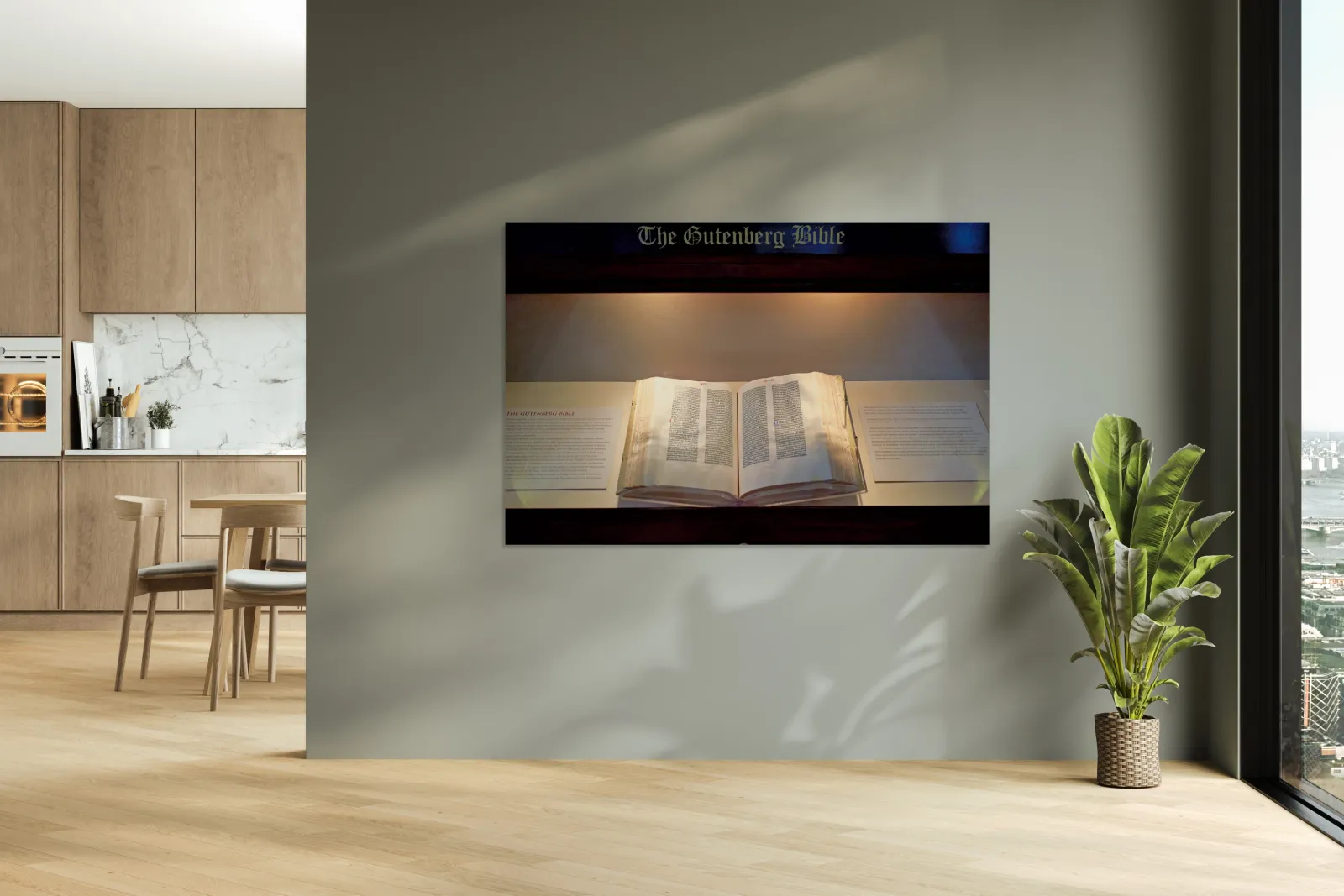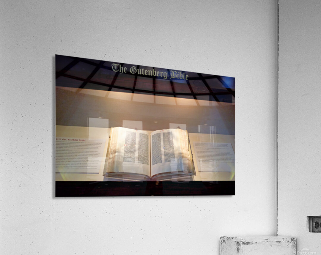 A historic book is open on display inside the Library of Congress in Washington D.C. It shows pages from the Gutenberg Bible and information.