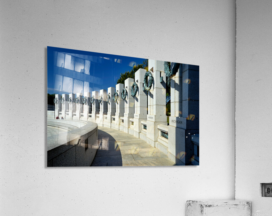 People walk near the columns of the National World War II Memorial in Washington D.C. Some are enjoying the day and taking pictures.