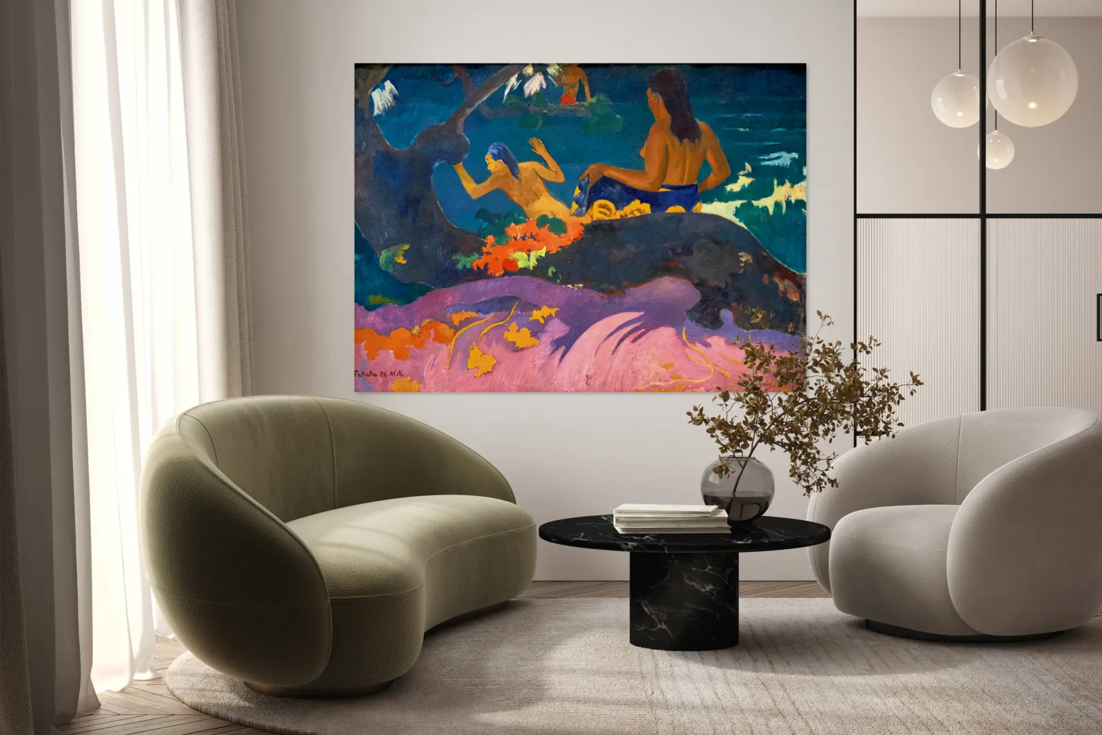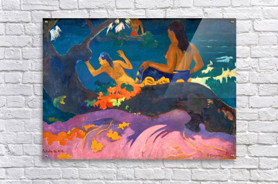 "Fatata te Miti shows people by the sea in Washington" in a framed print.