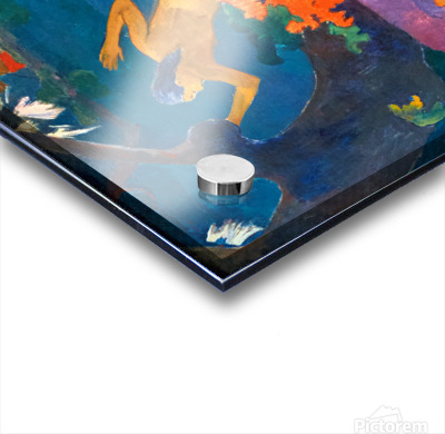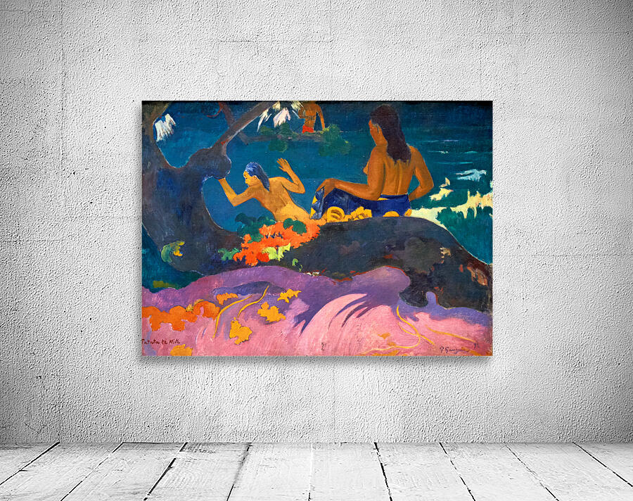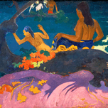 Gauguin. Two figures are near the water in this 1892 artwork. One is swimming while the other sits on the shore. The scene captures a coastal moment.
