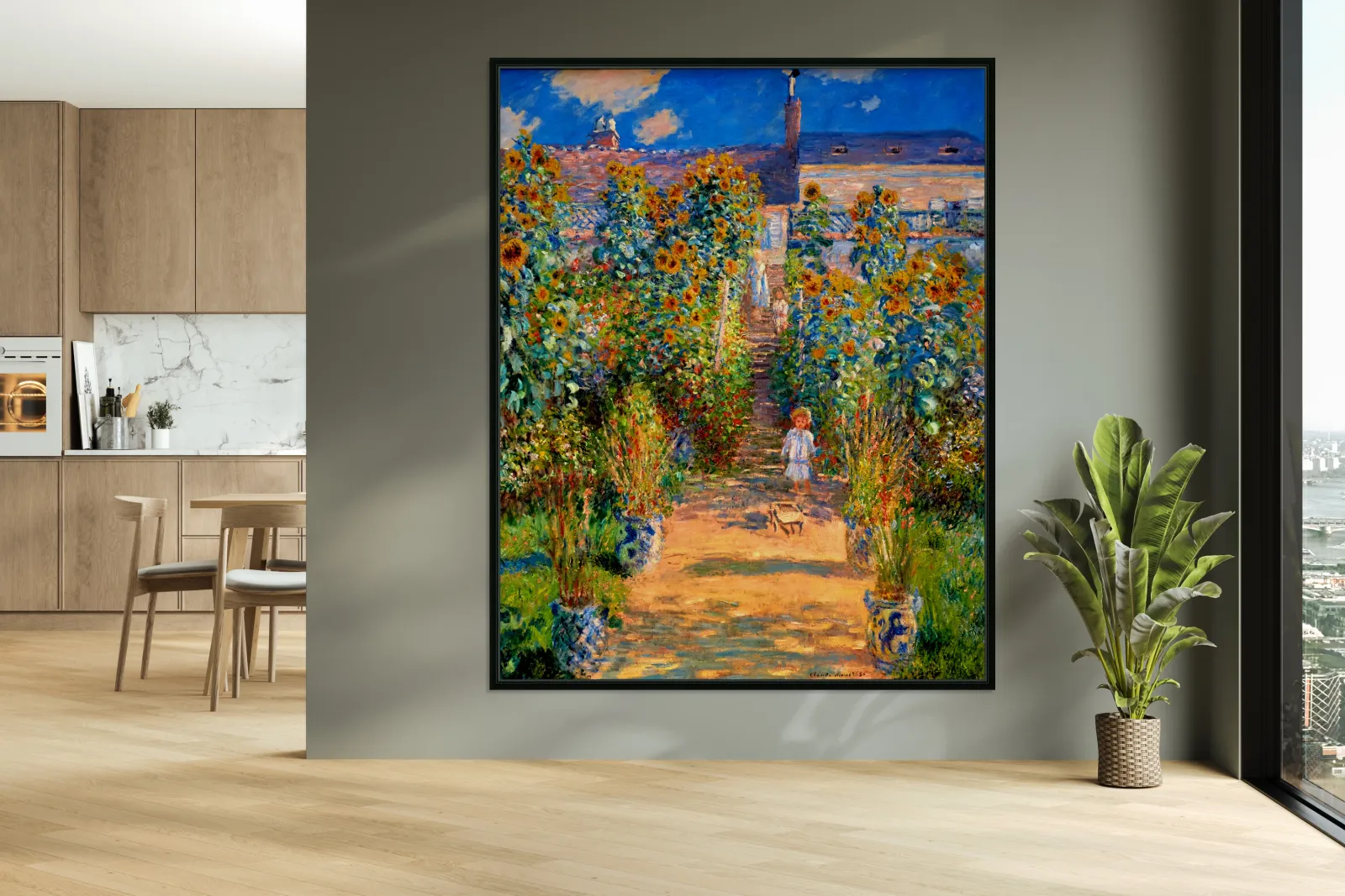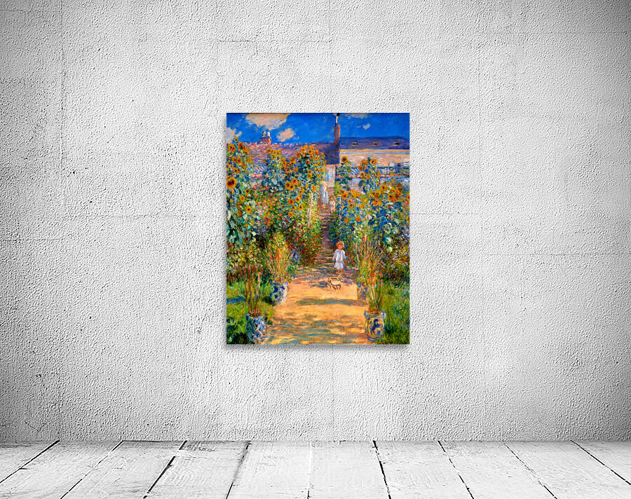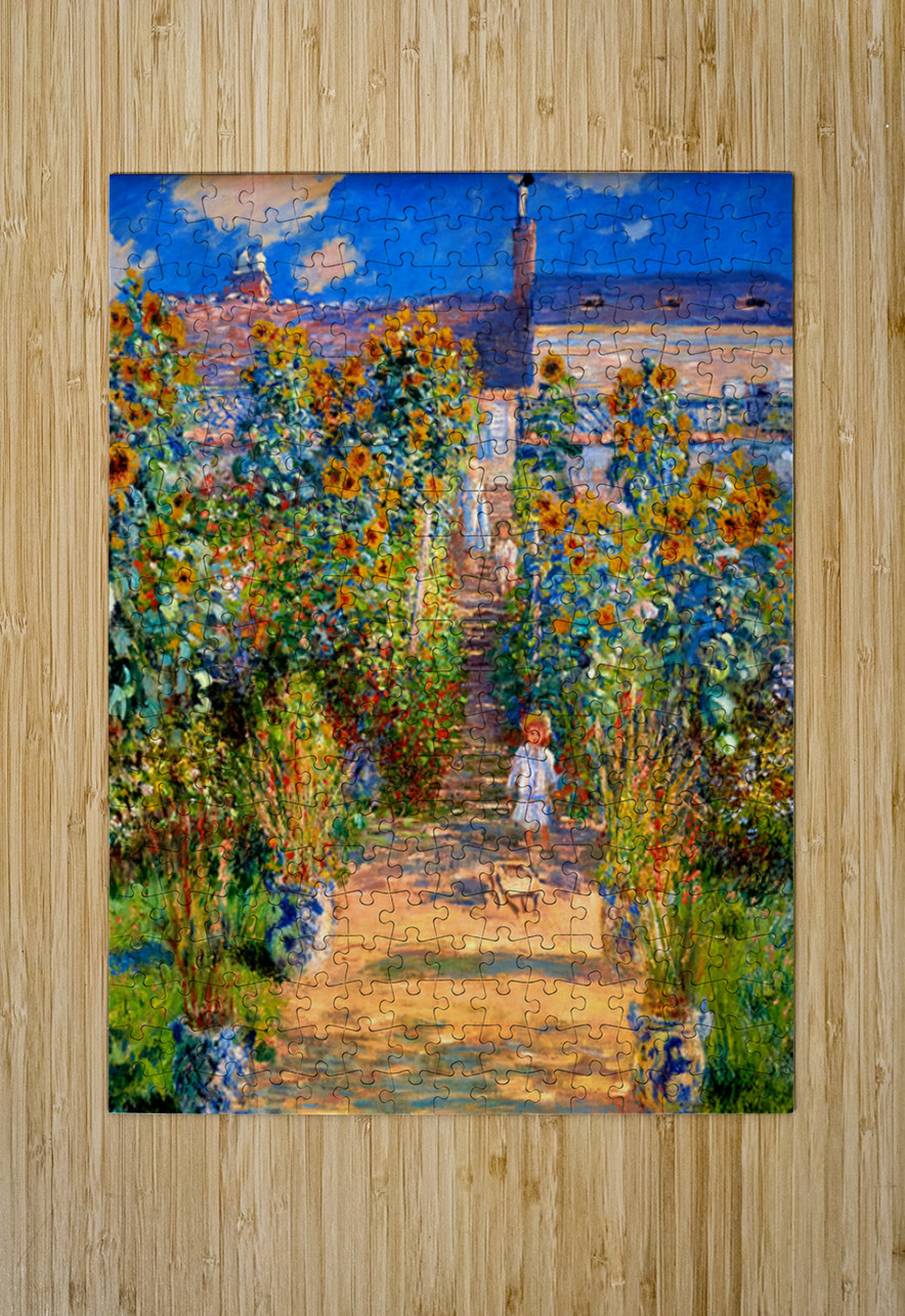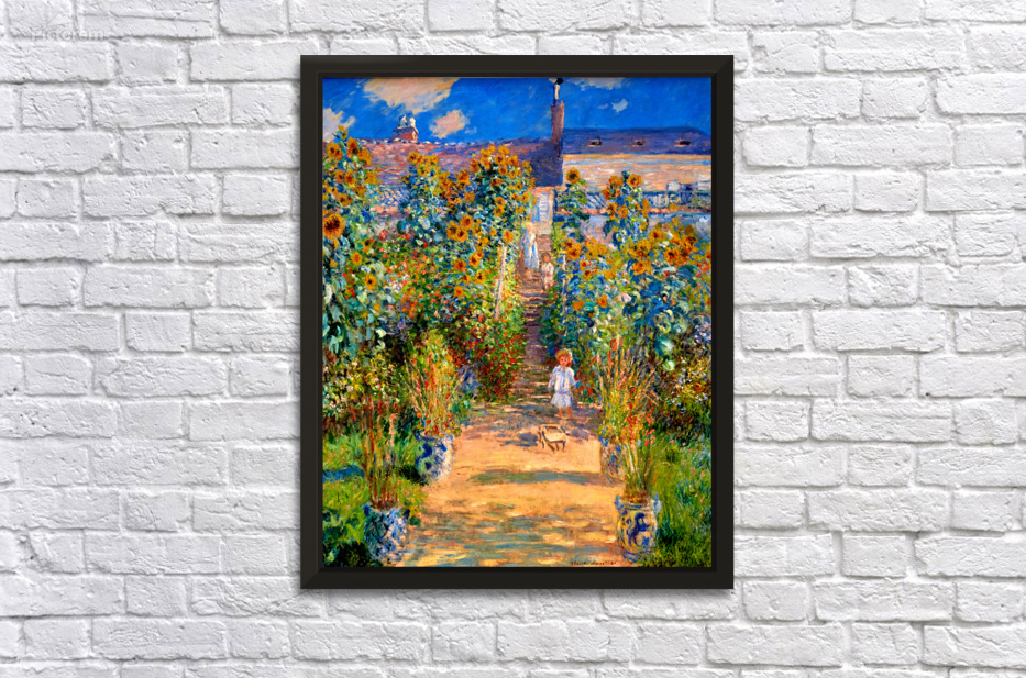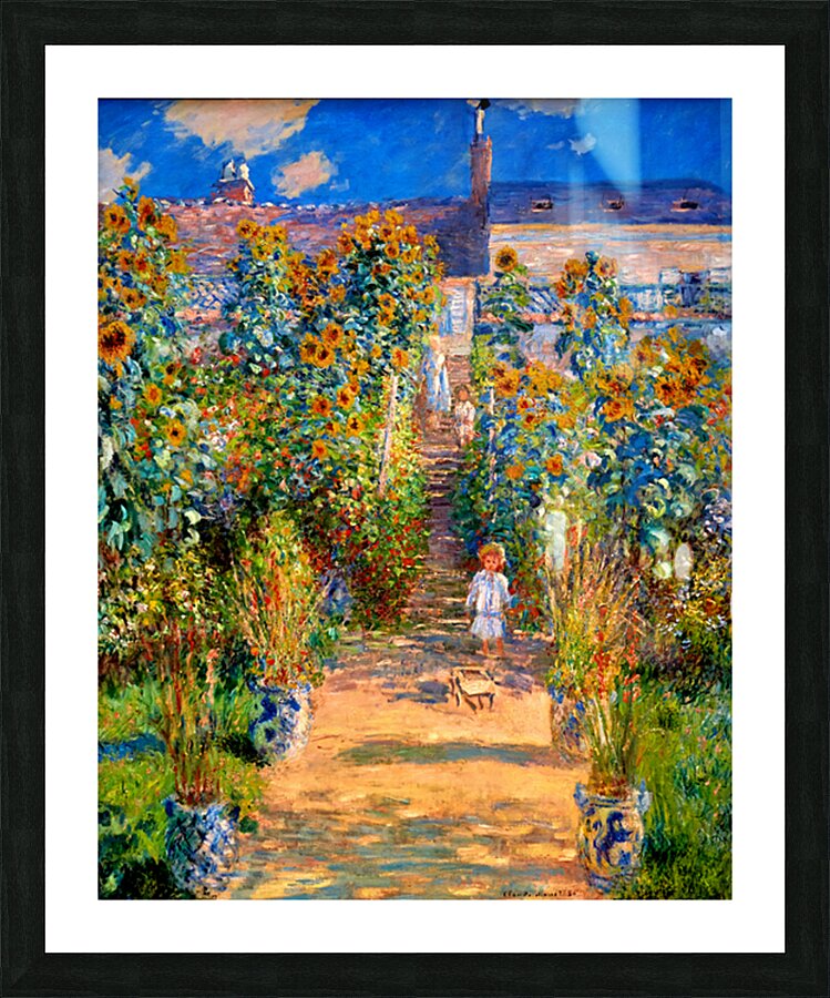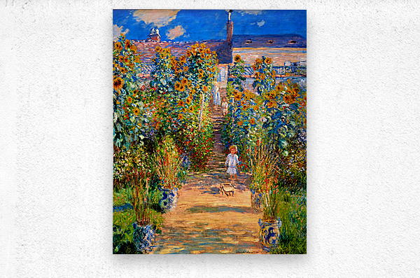 Monet. Garden steps lead up through tall sunflowers with figures walking and a dog nearby on a clear day in Washington D.C.