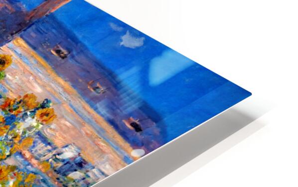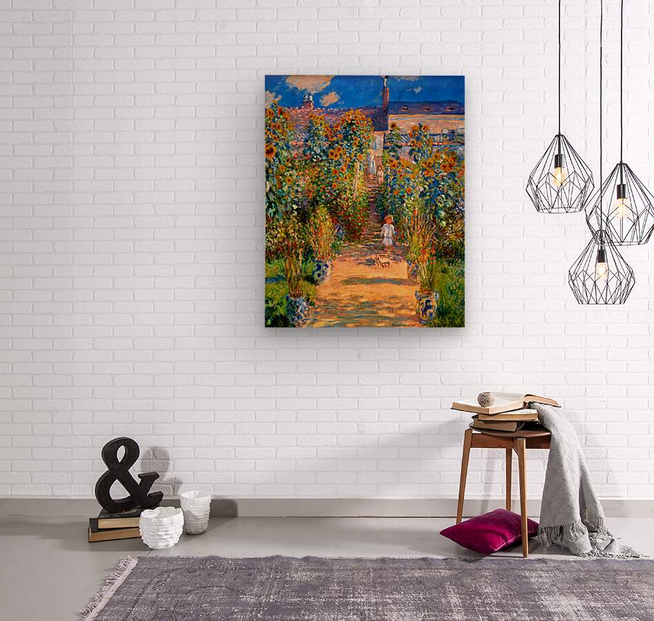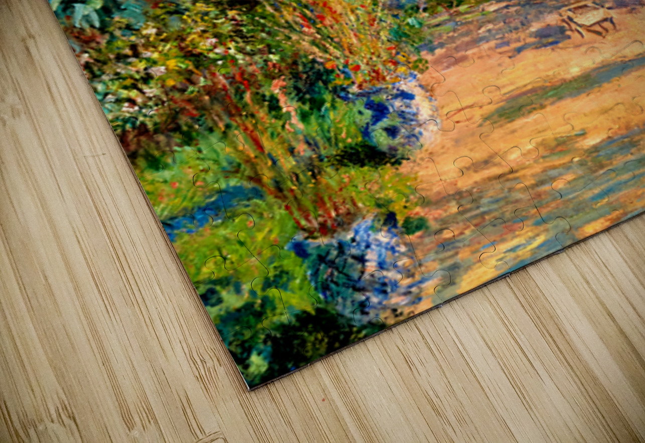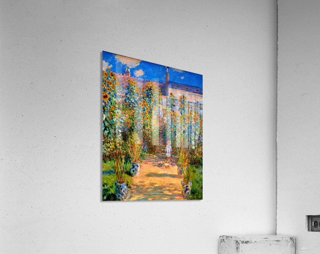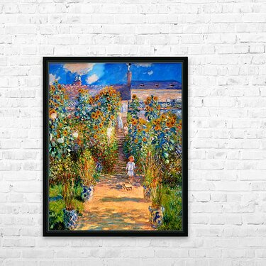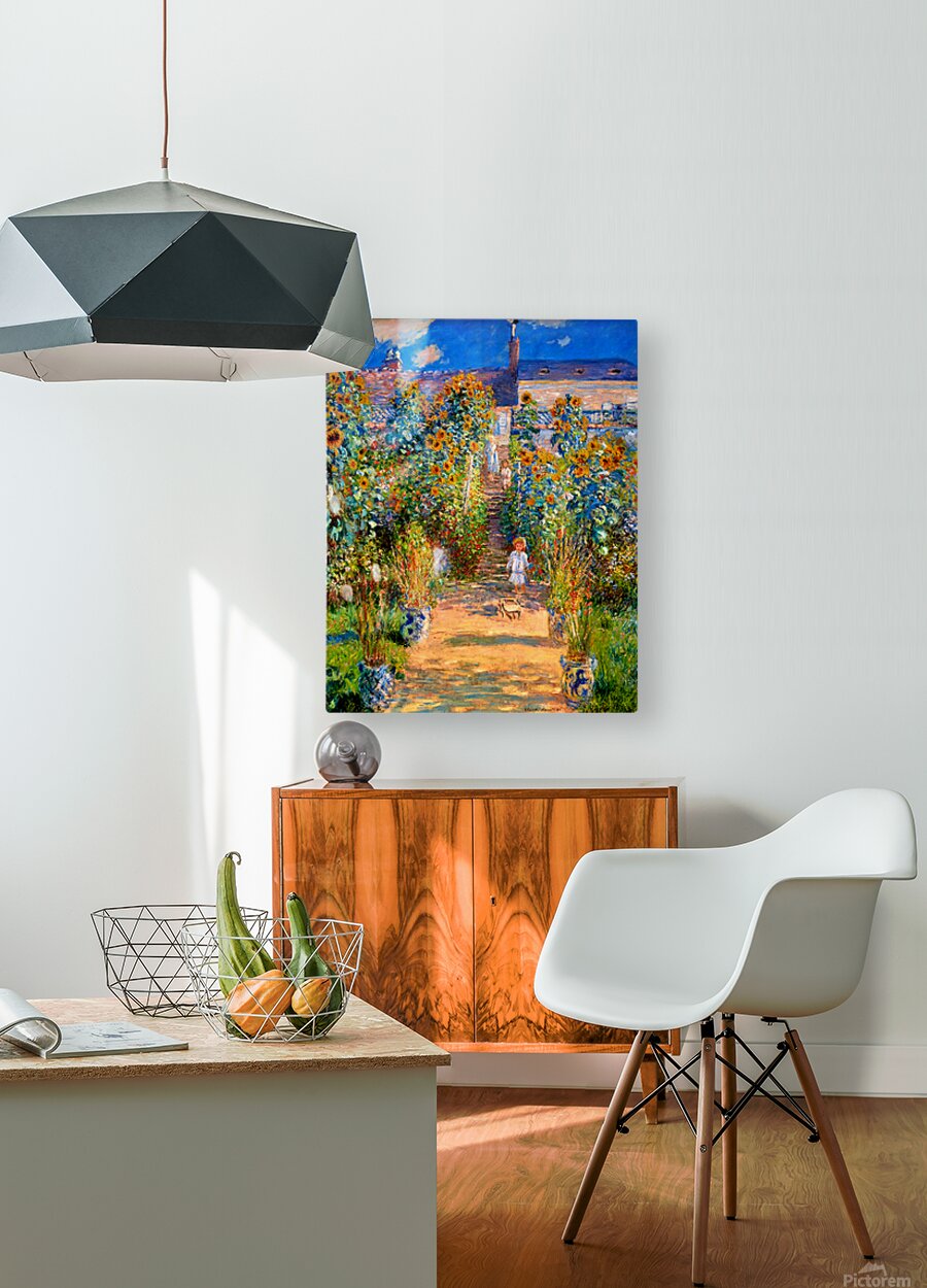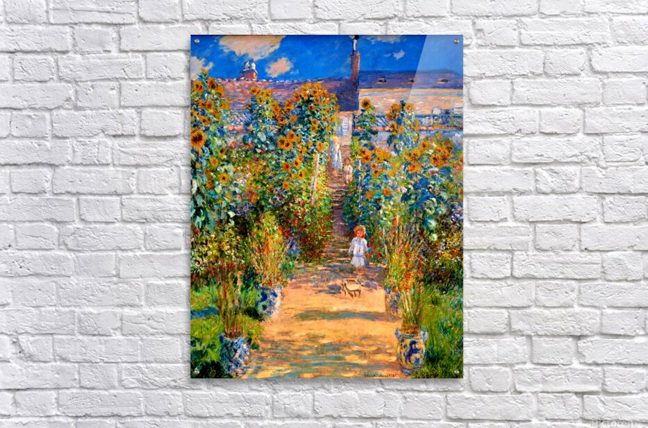 Monet. Garden steps lead up through tall sunflowers with figures walking and a dog nearby on a clear day in Washington D.C.