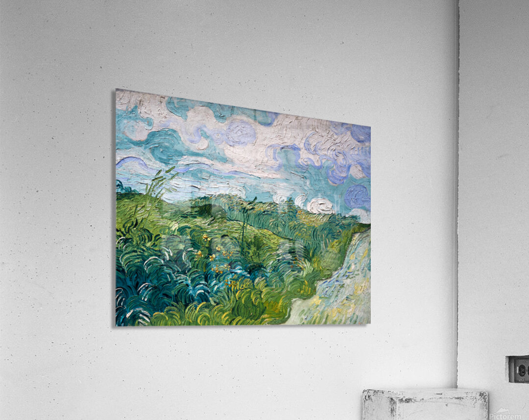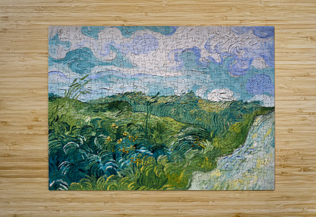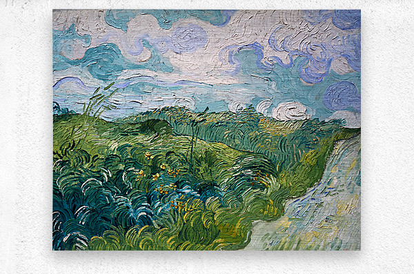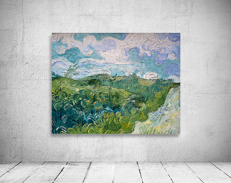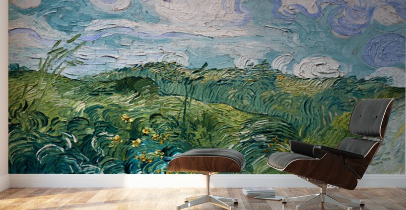 Vincent Van Goghs Green Wheat Fields shows a landscape with hills and clouds. This artwork reflects the artists focus on nature and scenery.