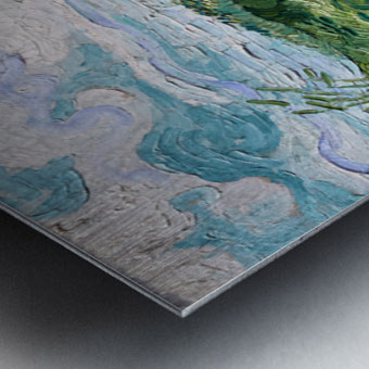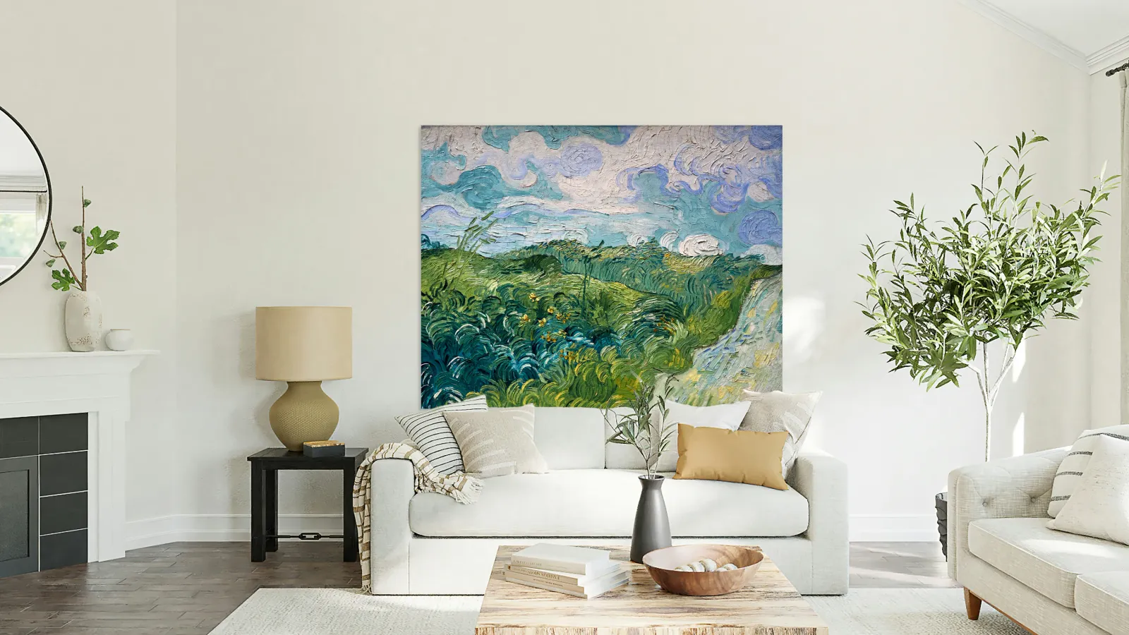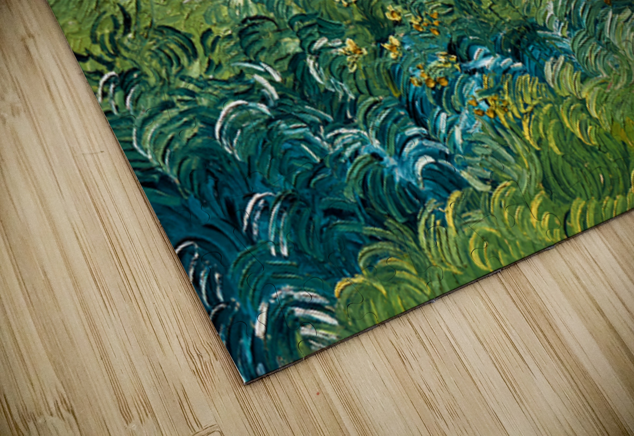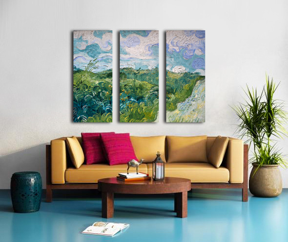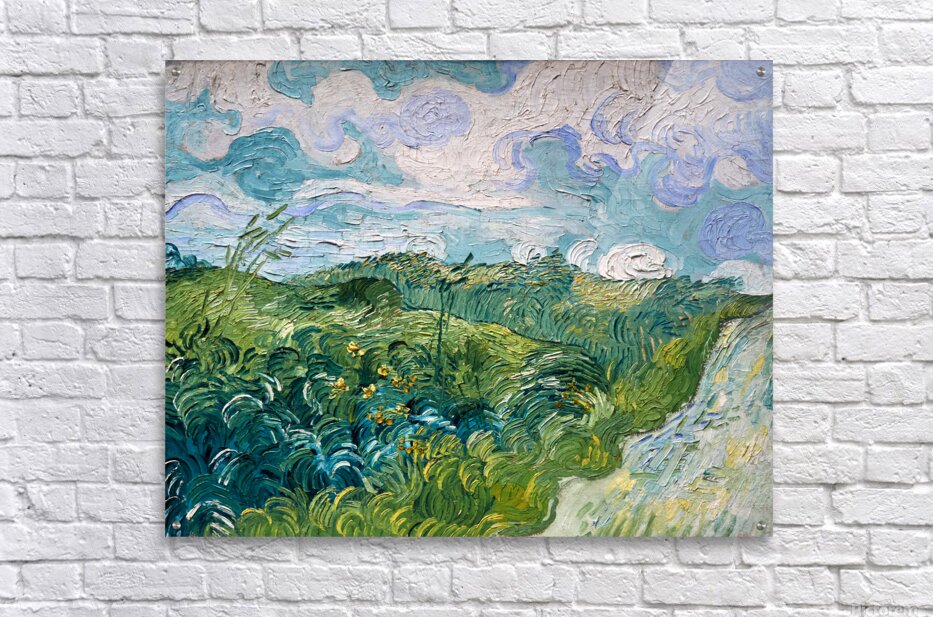 Vincent Van Goghs Green Wheat Fields shows a landscape with hills and clouds. This artwork reflects the artists focus on nature and scenery.