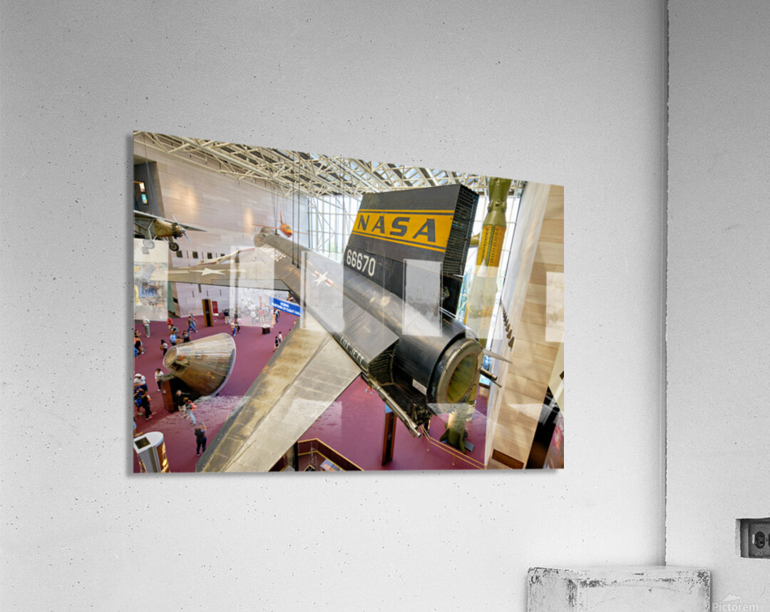 Visitors explore NASA spacecraft in the Smithsonian National Air and Space Museum in Washington D.C. Many people look up at the display.