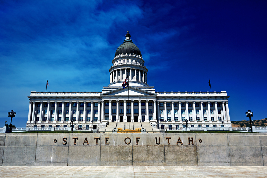 The Utah State Capitol is seen under a blue sky in Salt Lake City. This building serves as the center of government for Utah.