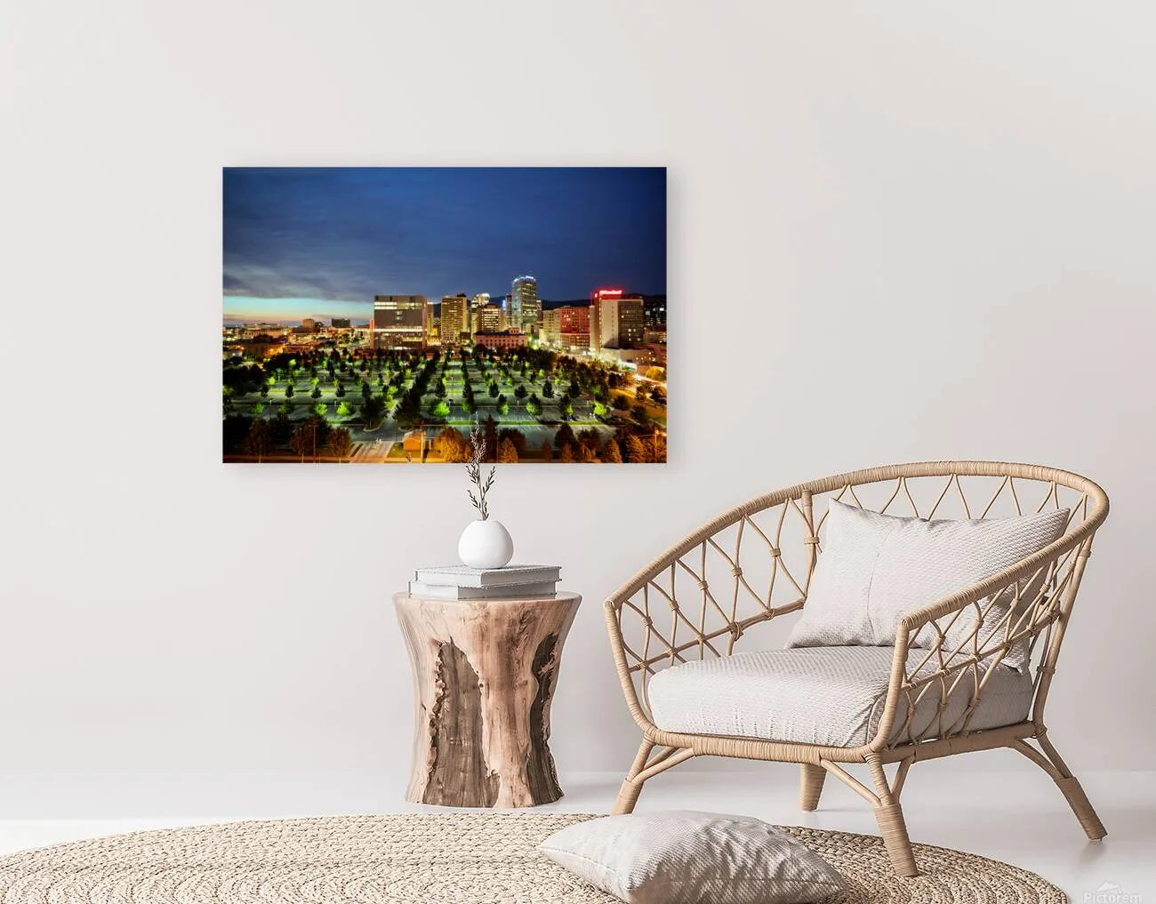 "Night view of Salt Lake City with bright buildings" in a framed print.