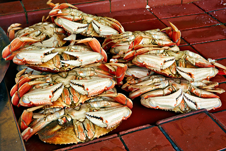 Fresh Dungeness crabs are arranged neatly at Fishermans Wharf in San Francisco. Visitors enjoy the local seafood offerings.