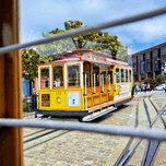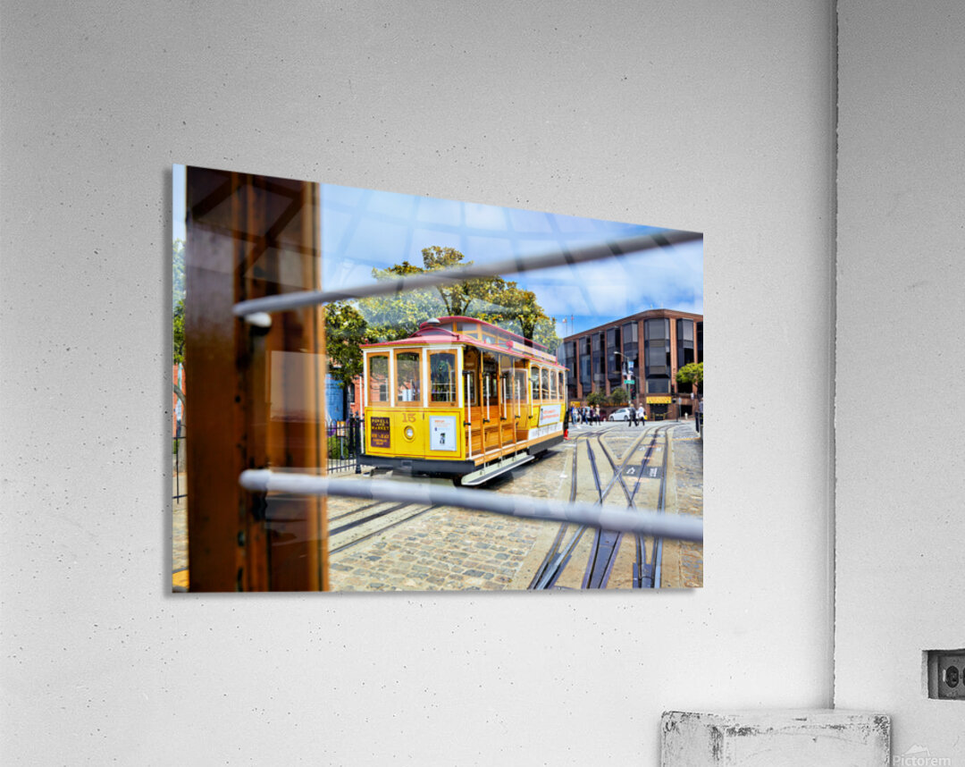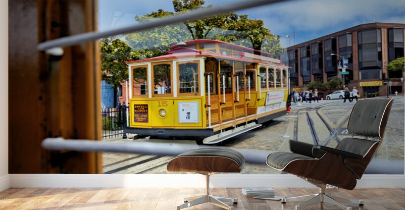 A cablecar moves along the streets of San Francisco passing by buildings and trees on a clear day. People walk nearby enjoying the city.