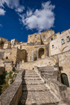Visitors walk through the ancient alleys of Matera. Historic buildings rise above stone steps. Bright sky adds to the scenery.