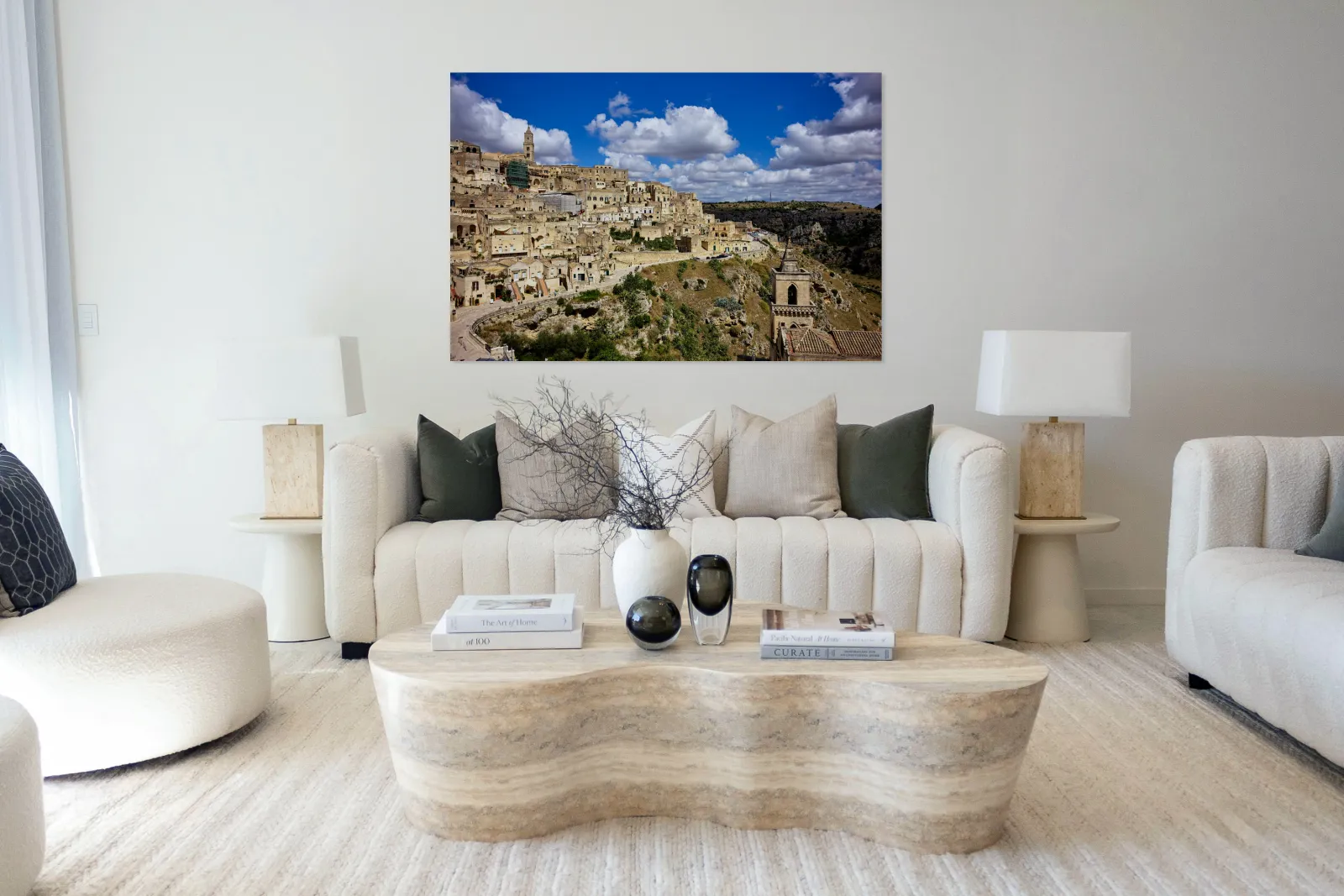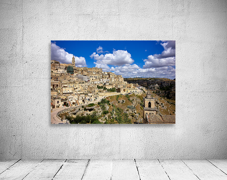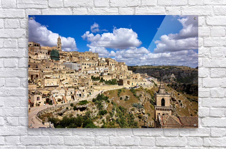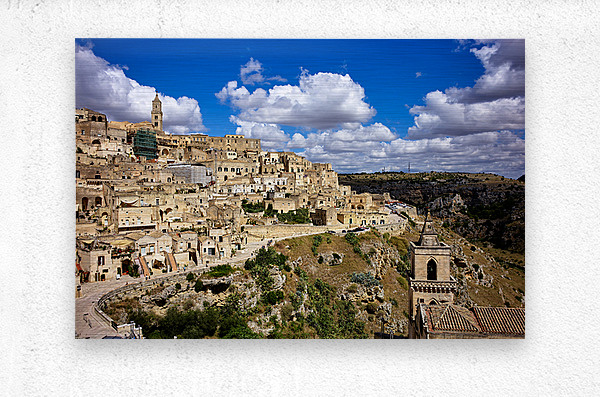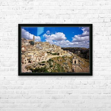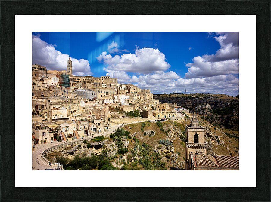 "Daytime view of Sassi di Matera Italy" in a framed print.