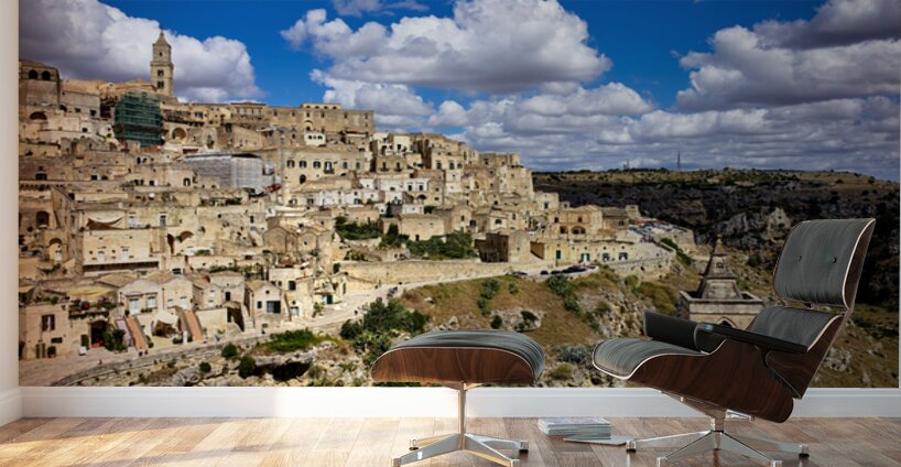 Cityscape shows the historic Sassi di Matera with stone buildings and blue sky.