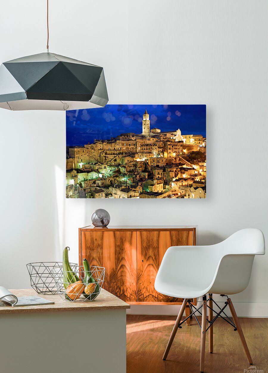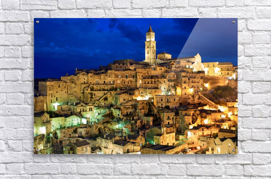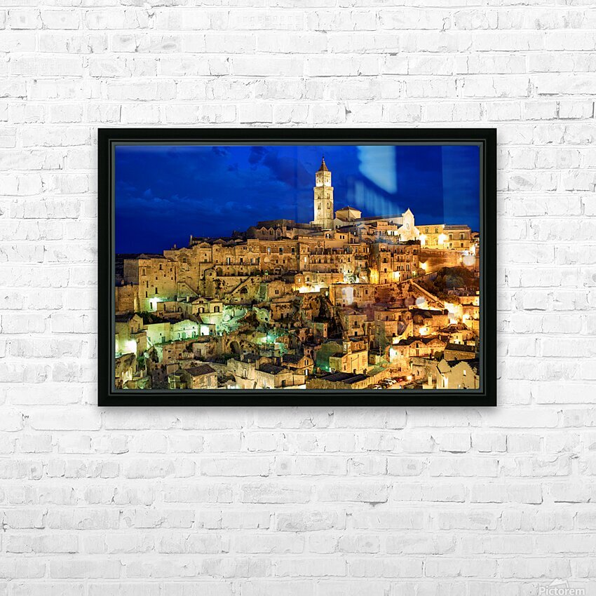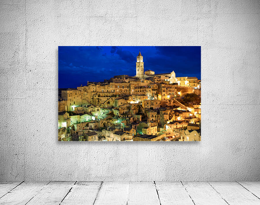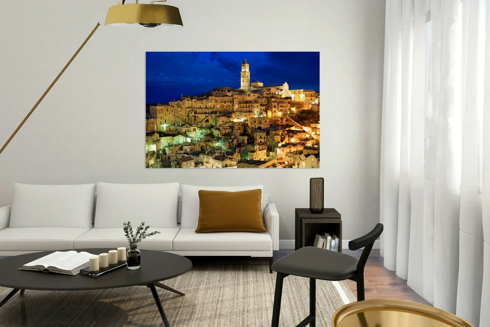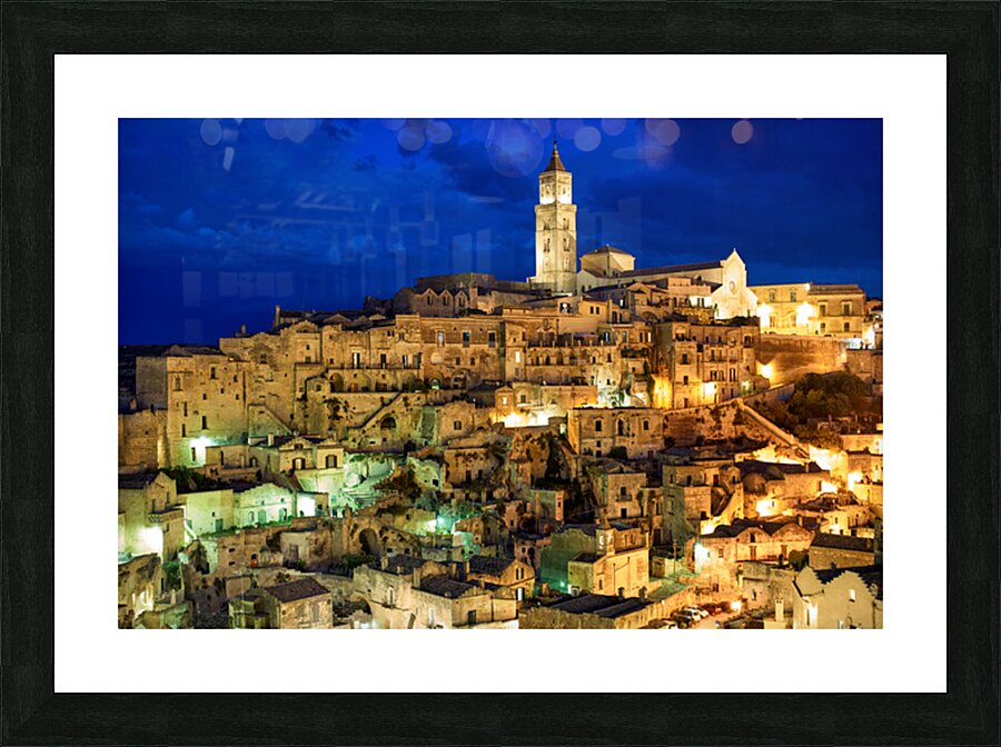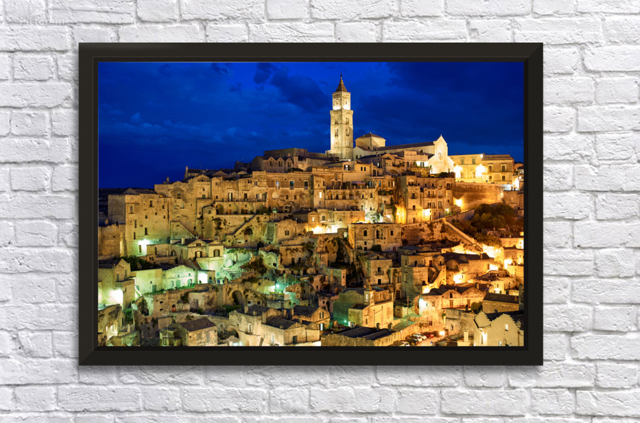 "Matera cityscape at night with illuminated buildings" in a framed print.