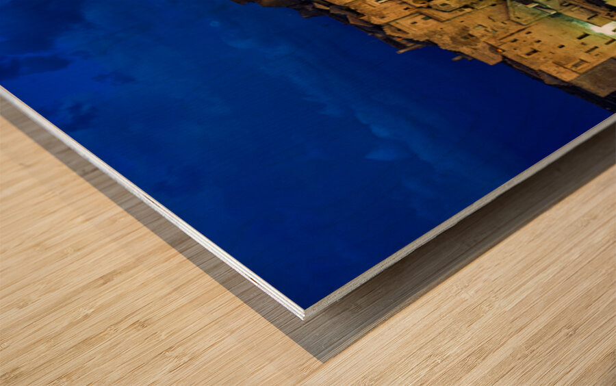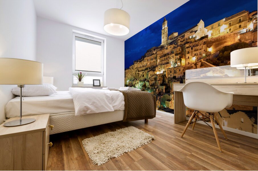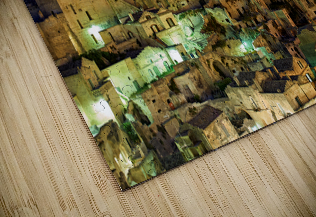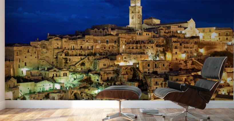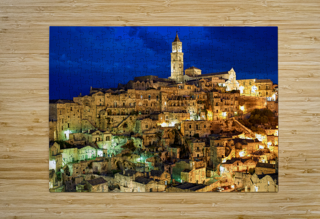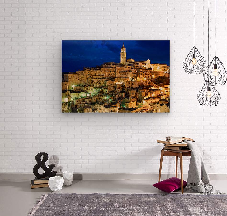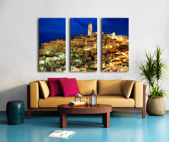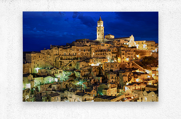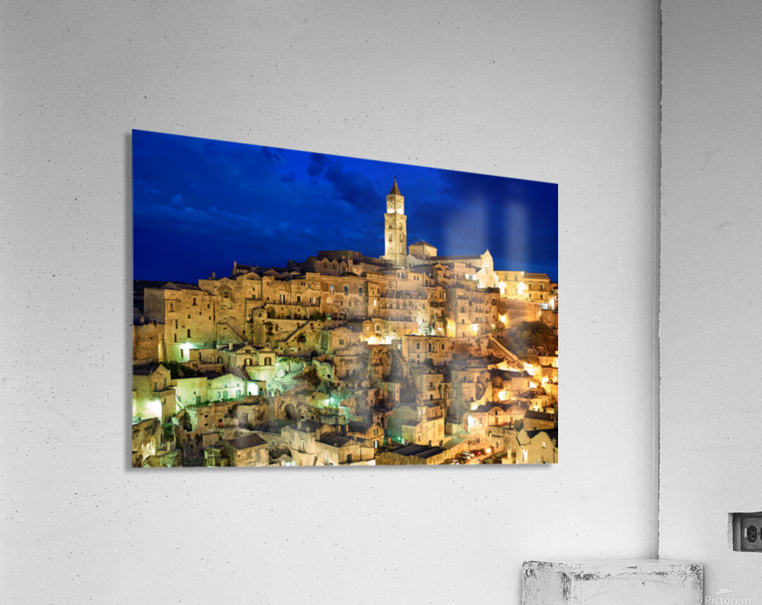 "Matera cityscape at night with illuminated buildings" in a framed print.