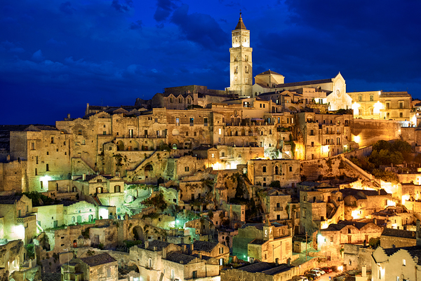 Matera shows its historic buildings and narrow streets at night. Lights shine from windows and streets bringing life to the ancient stones.