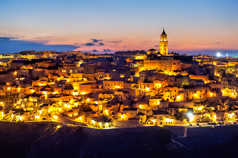Sassi di Matera glows at sunset with warm lights and a clear sky. The historic buildings blend into the night as the city comes alive.