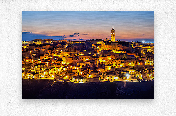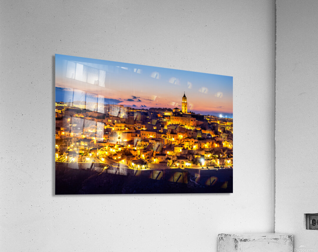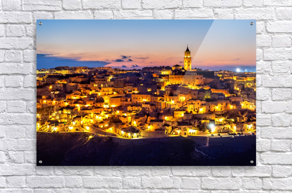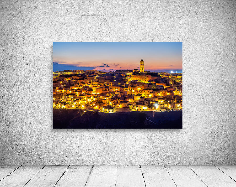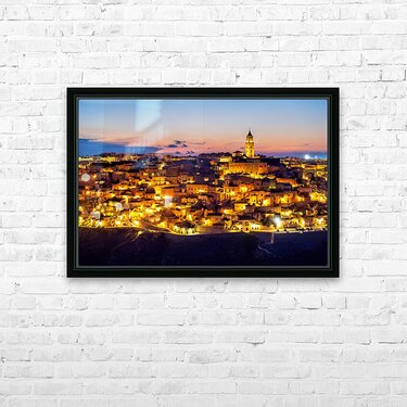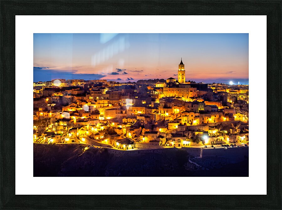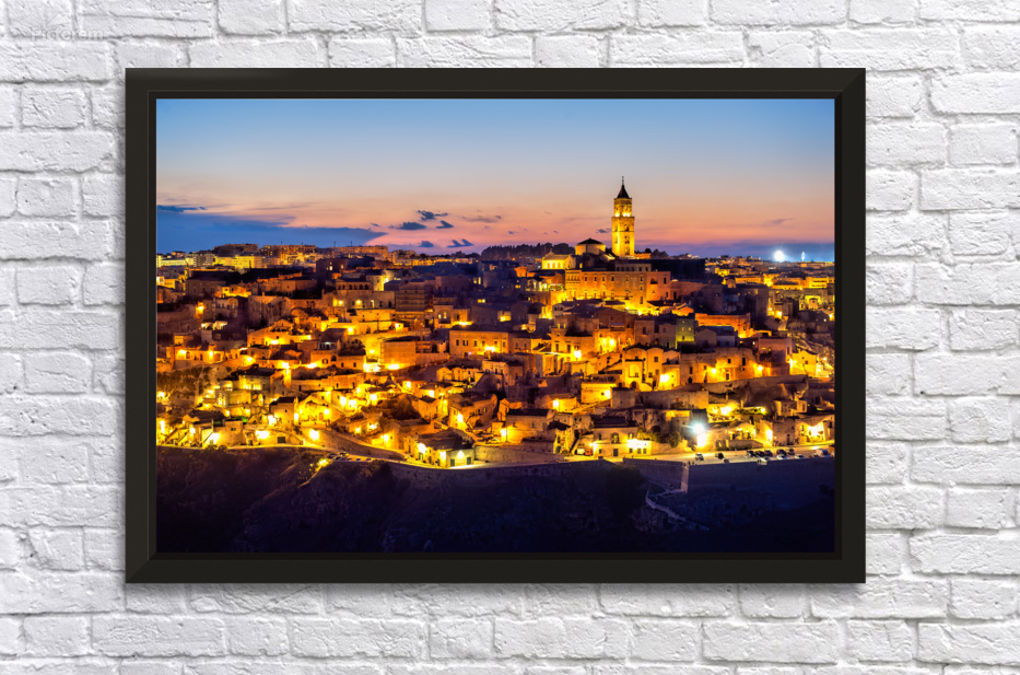 "Matera cityscape at sunset shows sassi di Matera glow" in a framed print.