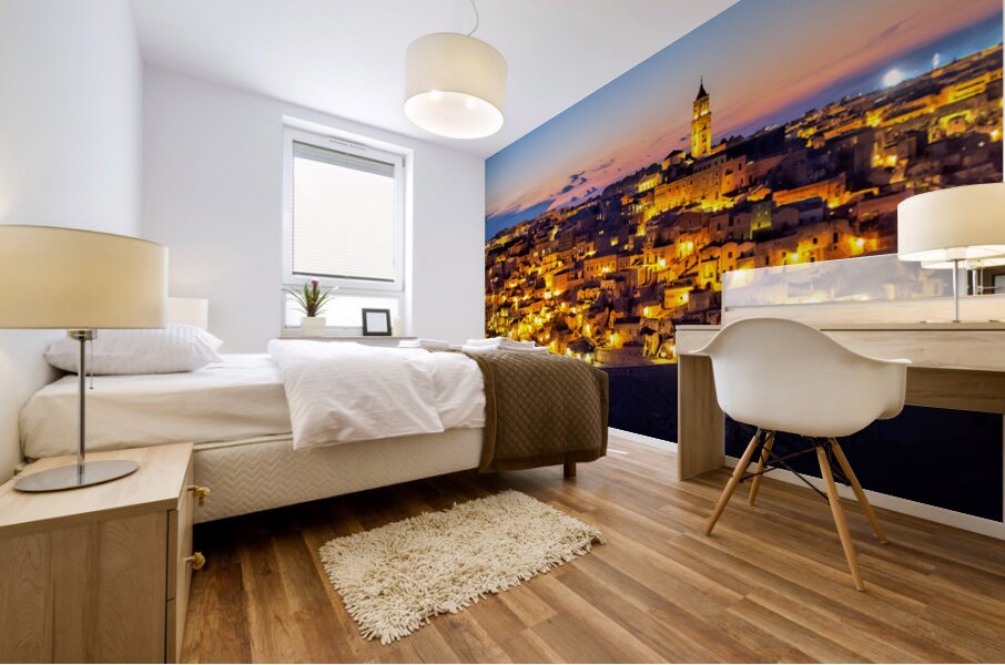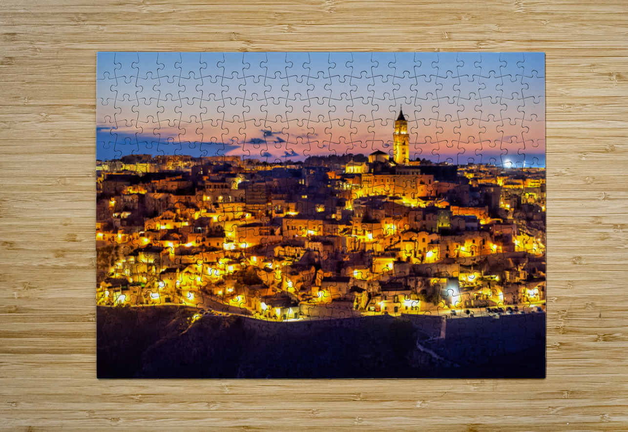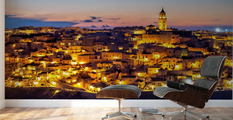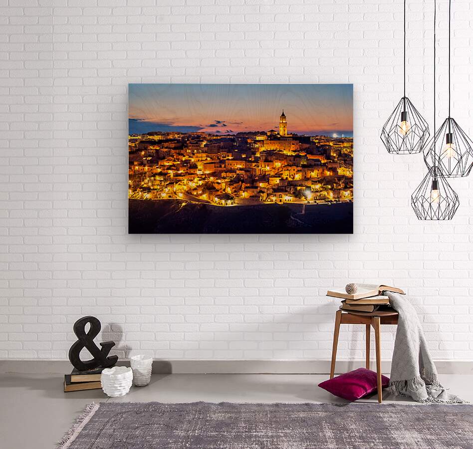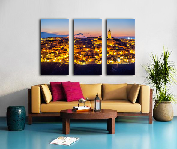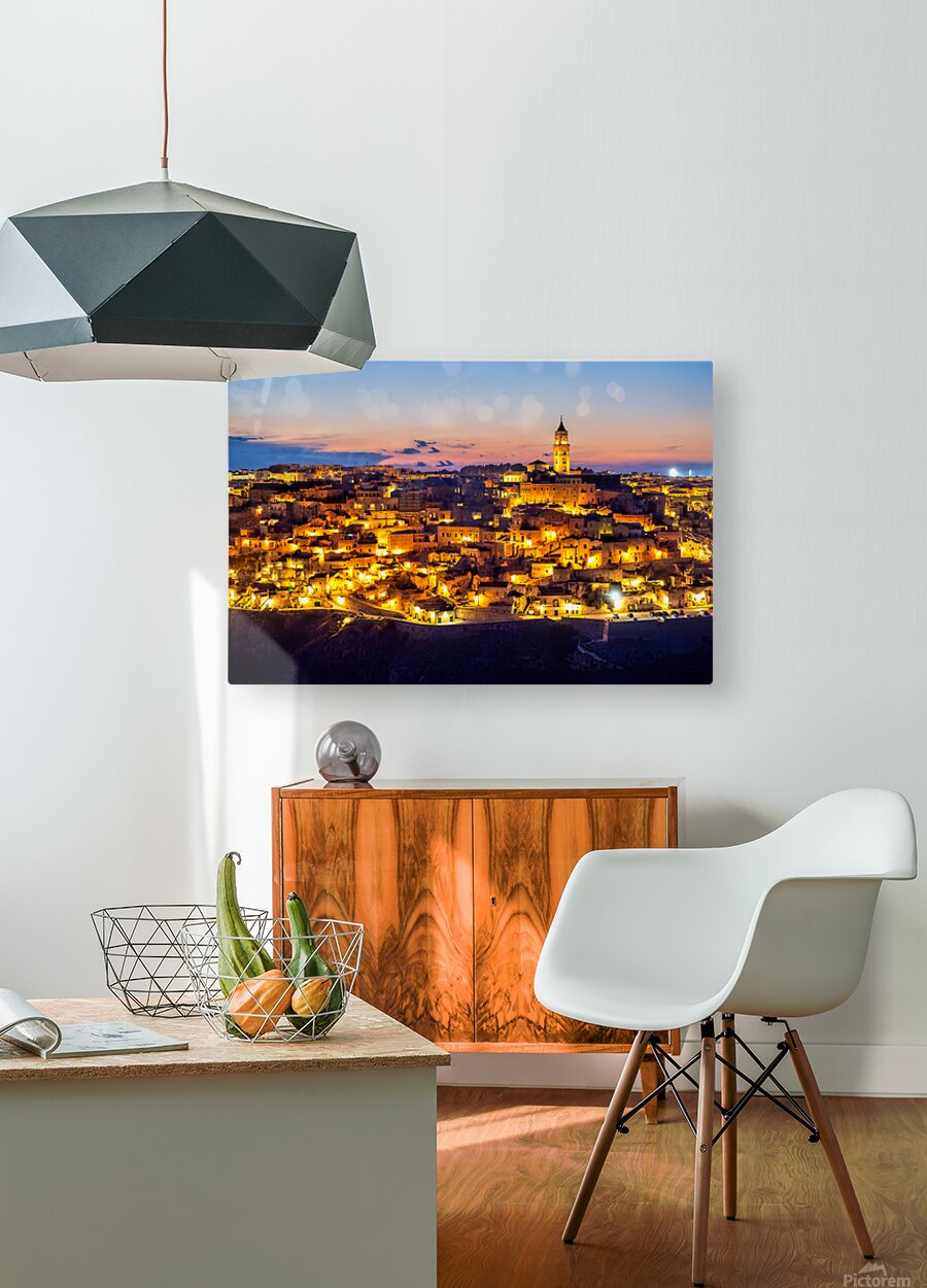 "Matera cityscape at sunset shows sassi di Matera glow" in a framed print.