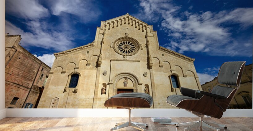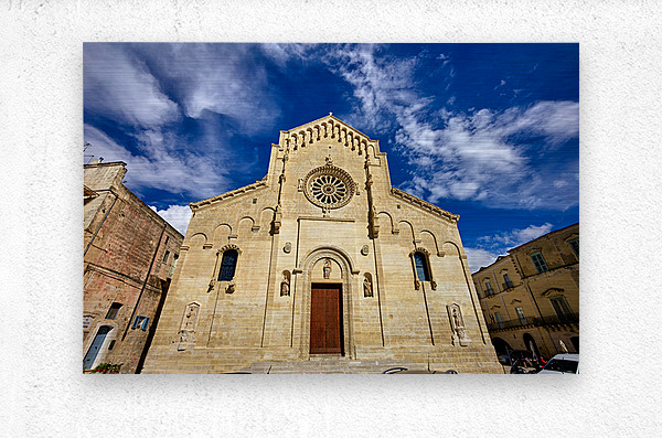 Basilica Pontificia Cattedrale stands tall in Matera Italy showcasing its architectural design under a bright blue sky.