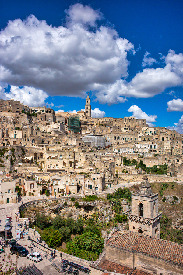 The ancient stone houses of Sassi di Matera in Italy. The buildings sit on hills under a bright blue sky with clouds.