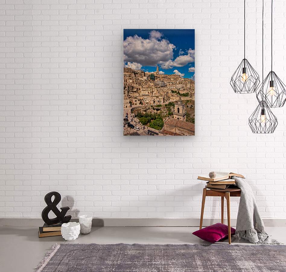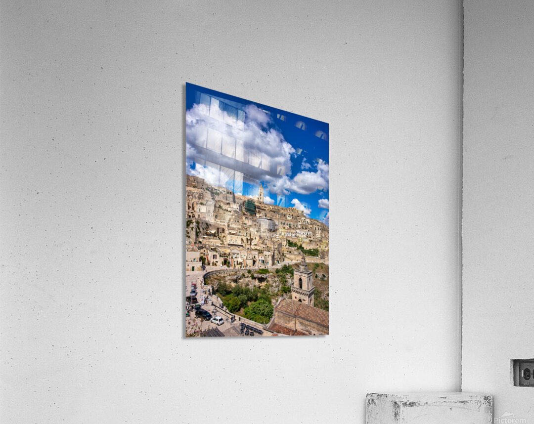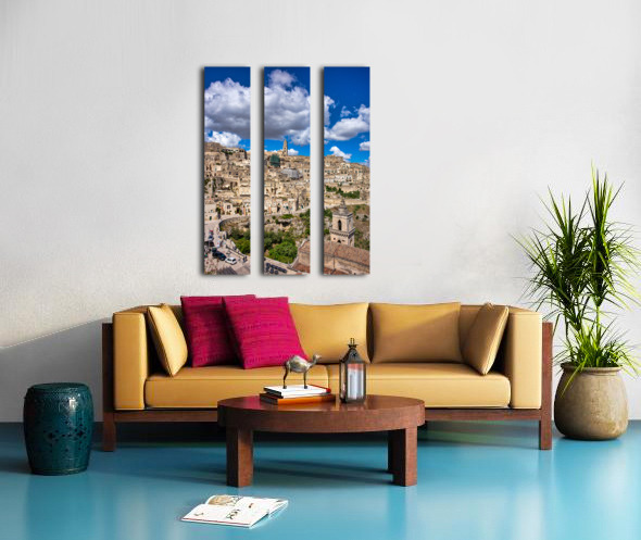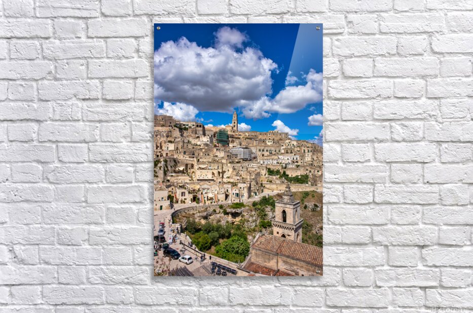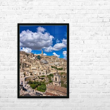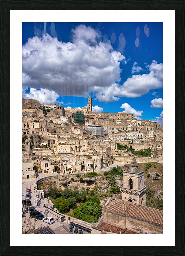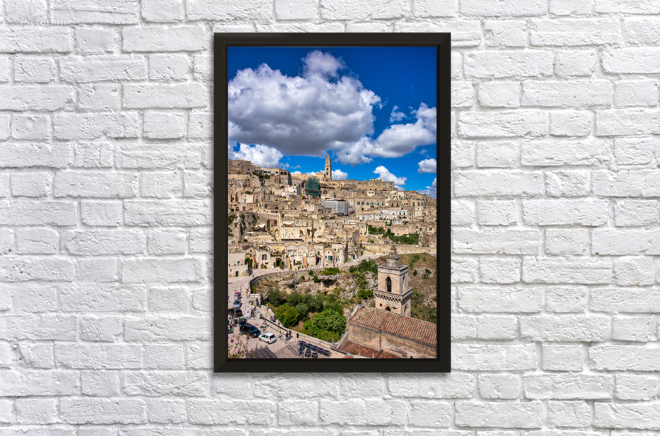 "Cityscape of Sassi di Matera in Italy under a blue sky" in a framed print.