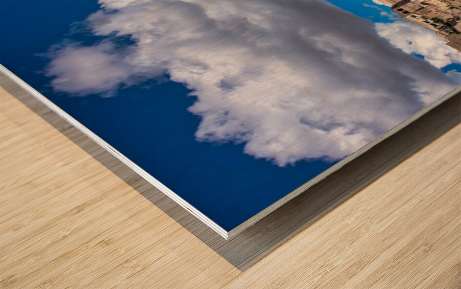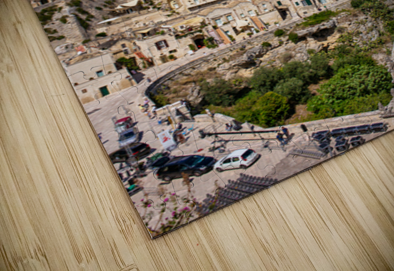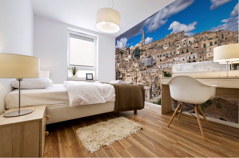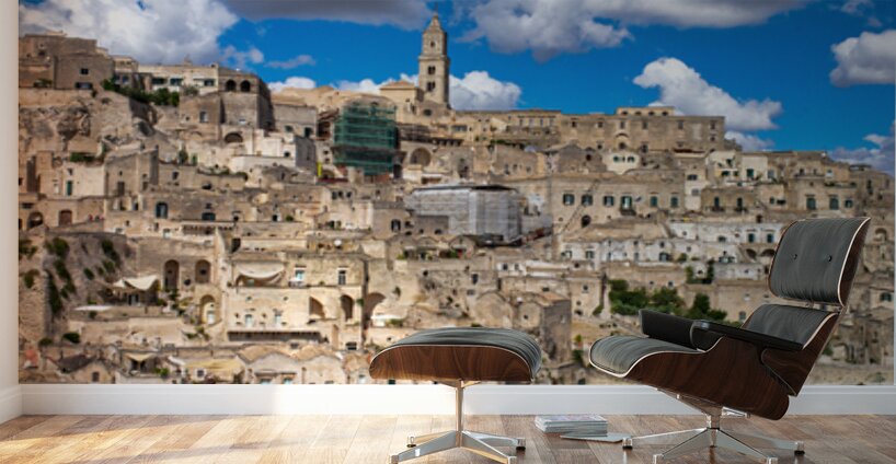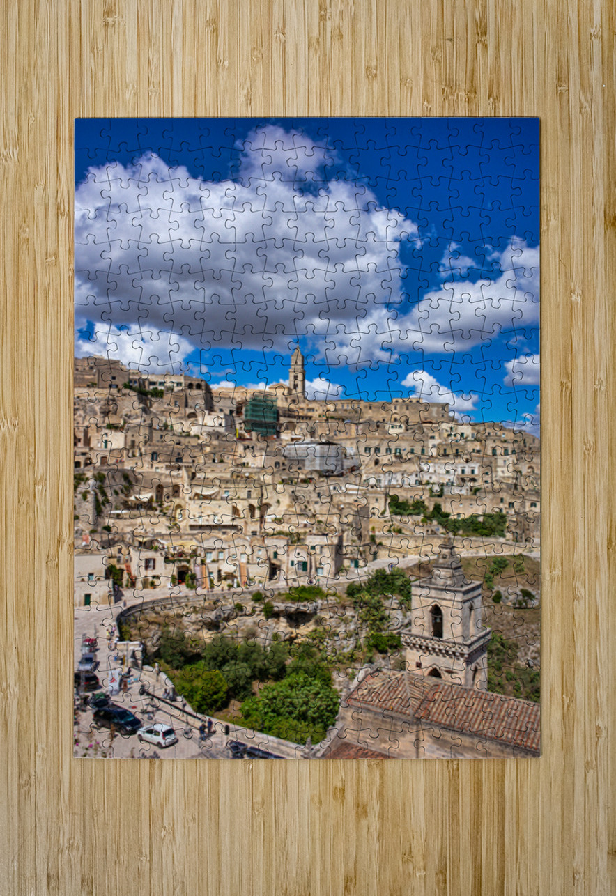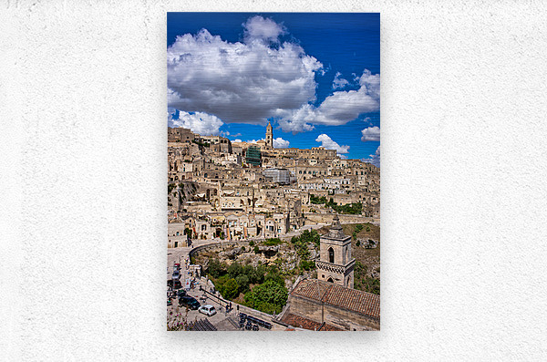 "Cityscape of Sassi di Matera in Italy under a blue sky" in a framed print.