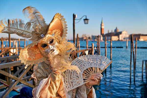 People celebrate at Venice Carnival wearing masks and costumes while the sun sets over the water creating a lively atmosphere in Venice.