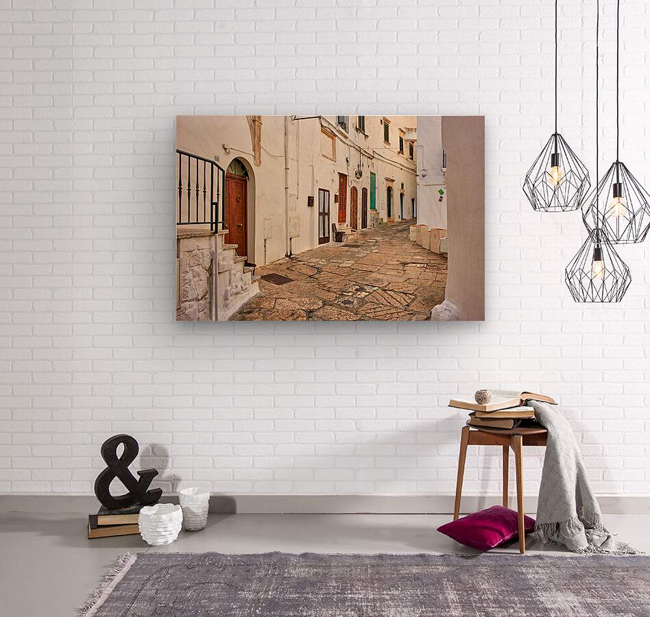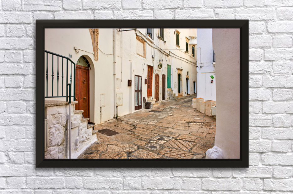 "Apulia Puglia Italy. Ostuni. The white town. The narrow alleys of the old town" dans une impression encadrée.