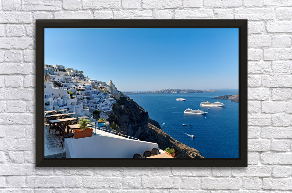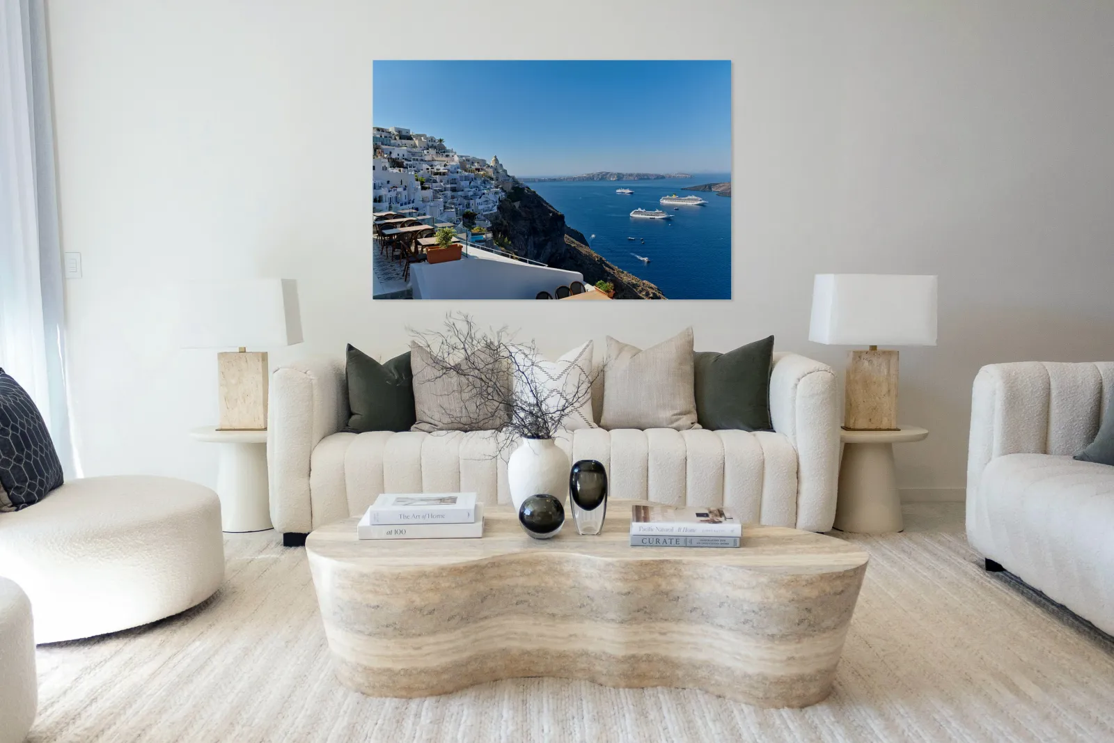 Santorini Greece: White cliffside villages overlook the Aegean Sea dotted with cruise ships. Tourists enjoy the iconic caldera views.