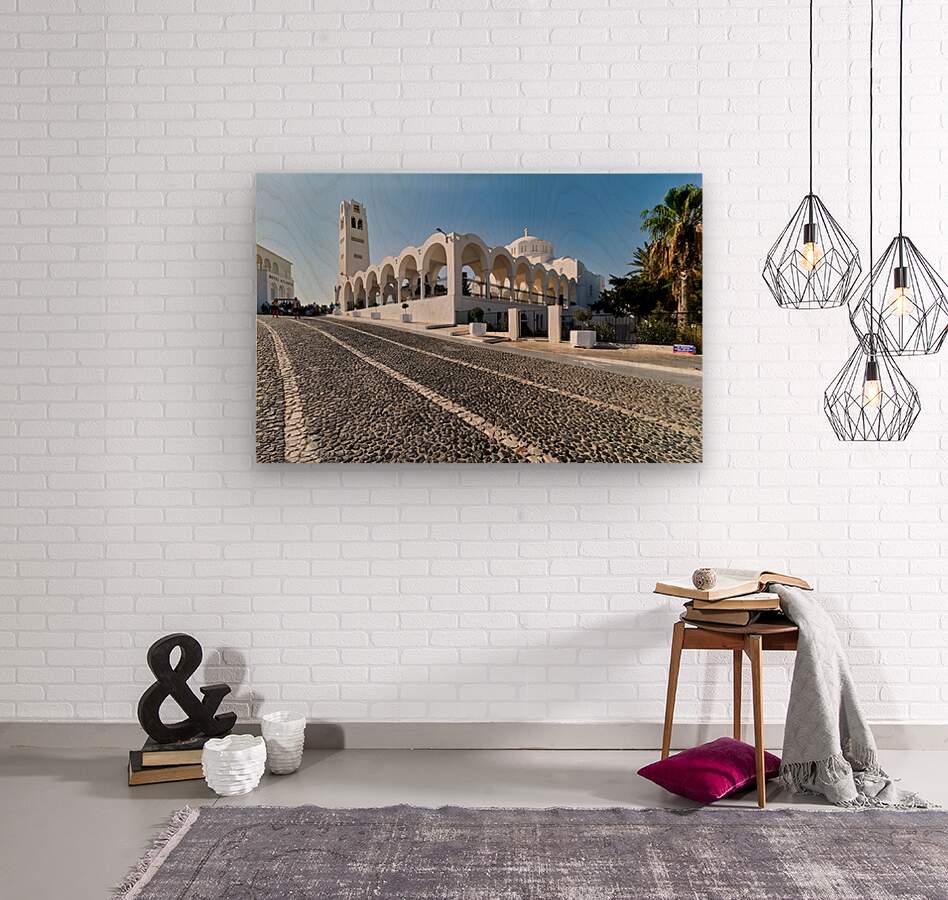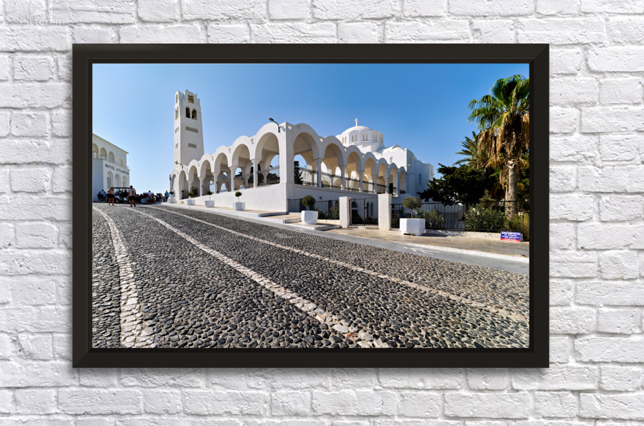 Tourists walk on a cobblestone street past the white Metropolitan Cathedral of Thira and Hotel Atlantis in Fira Santorini Greece.