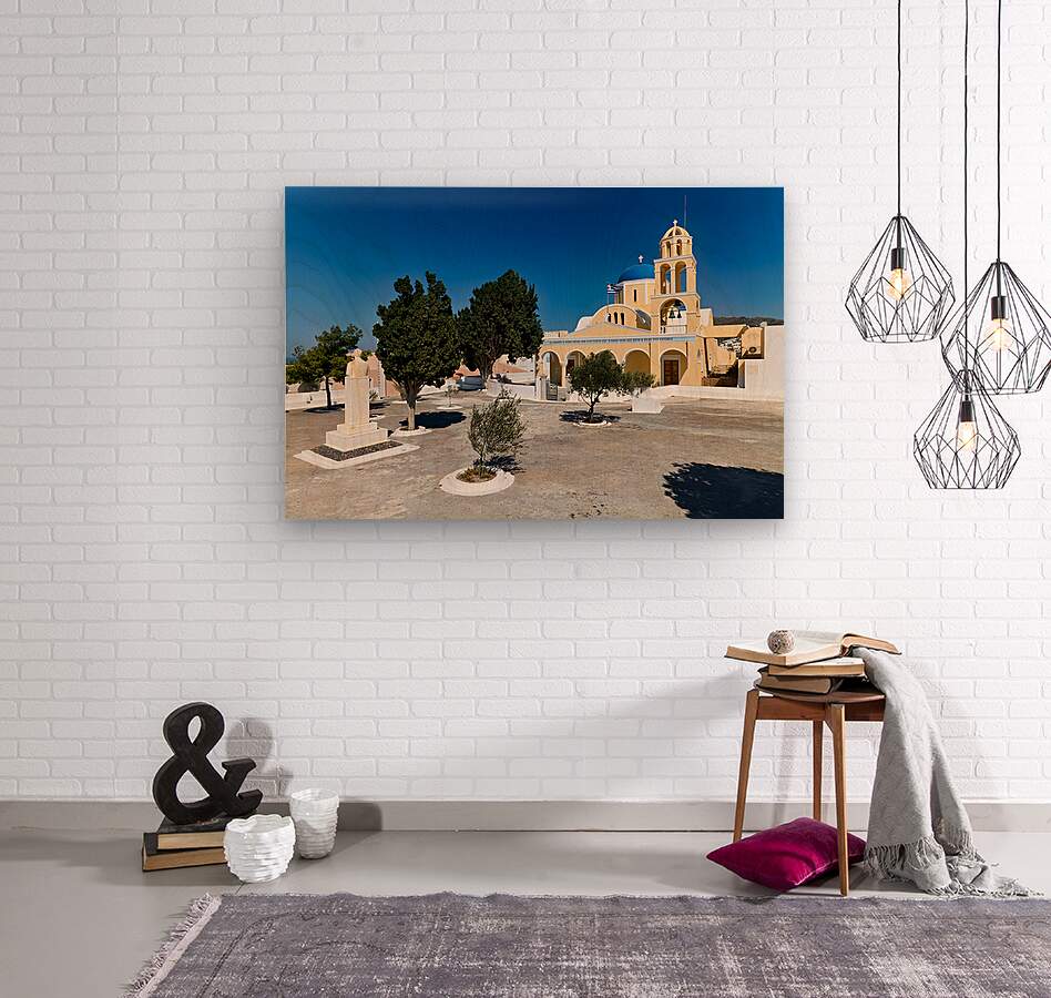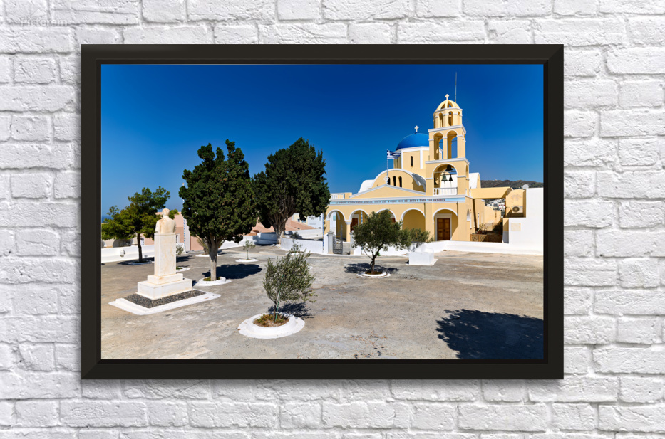 "Traditional Greek church blue dome bell tower sunny day." dans une impression encadrée.