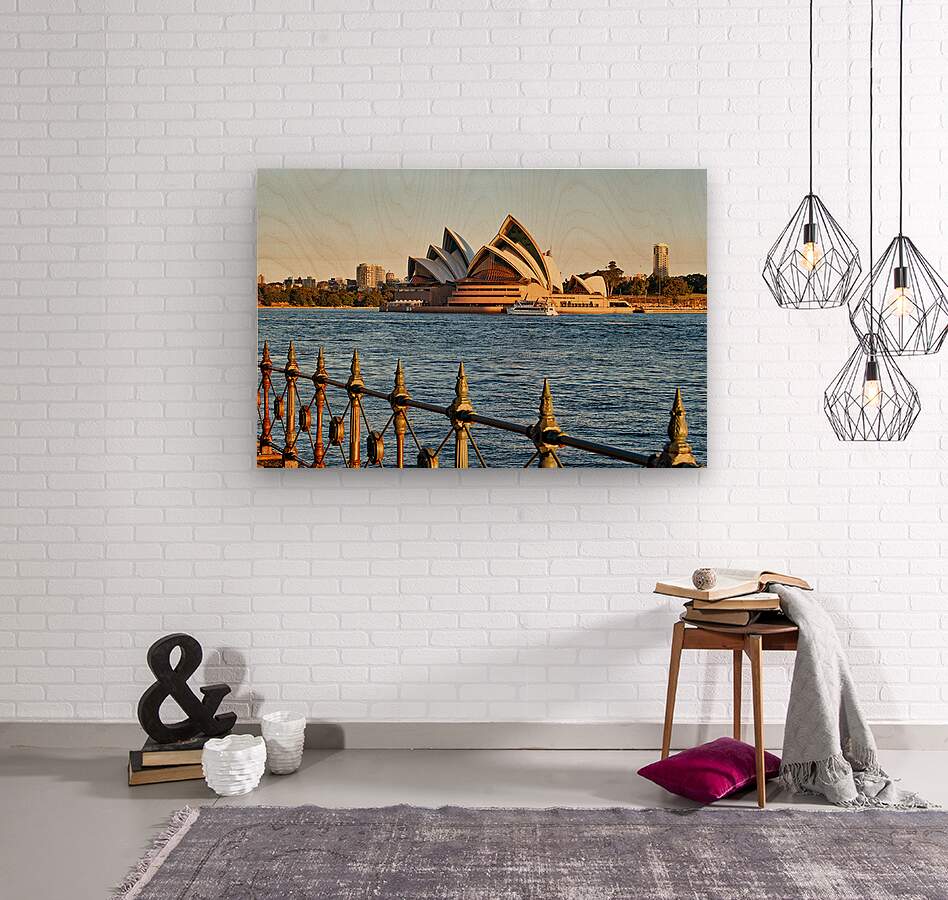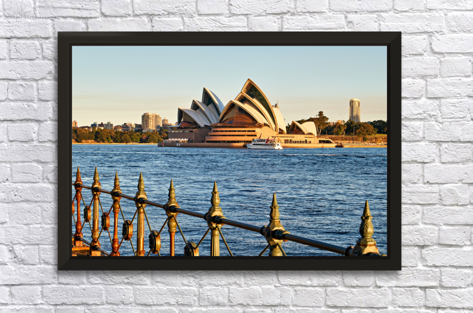"Sydney Opera House and harbor at sunset." dans une impression encadrée.