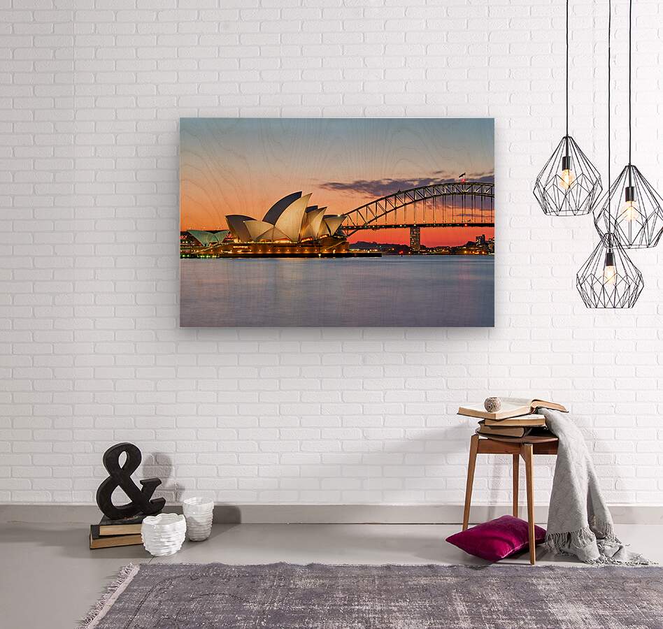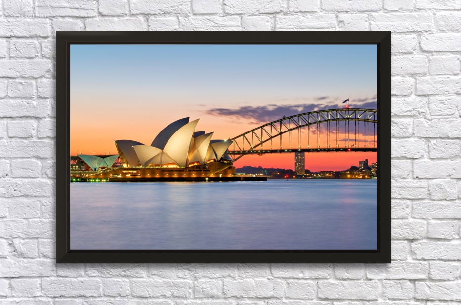 Sydney Opera House and Harbour Bridge at sunset Australia. Iconic landmarks illuminated against a vibrant sky.