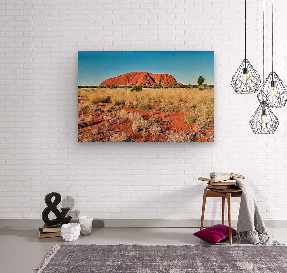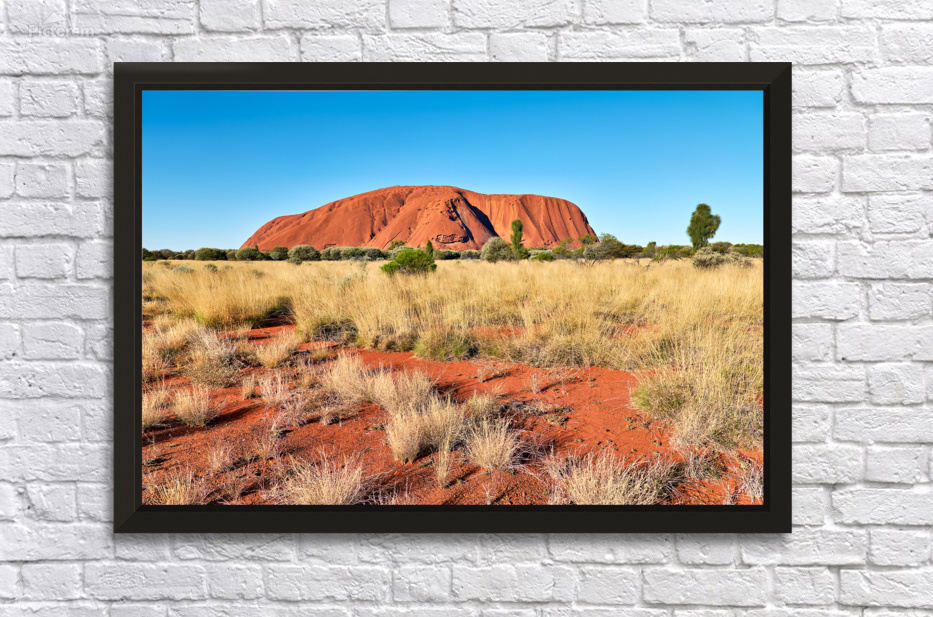 "Uluru Australias iconic sandstone monolith under a clear blue" dans une impression encadrée.