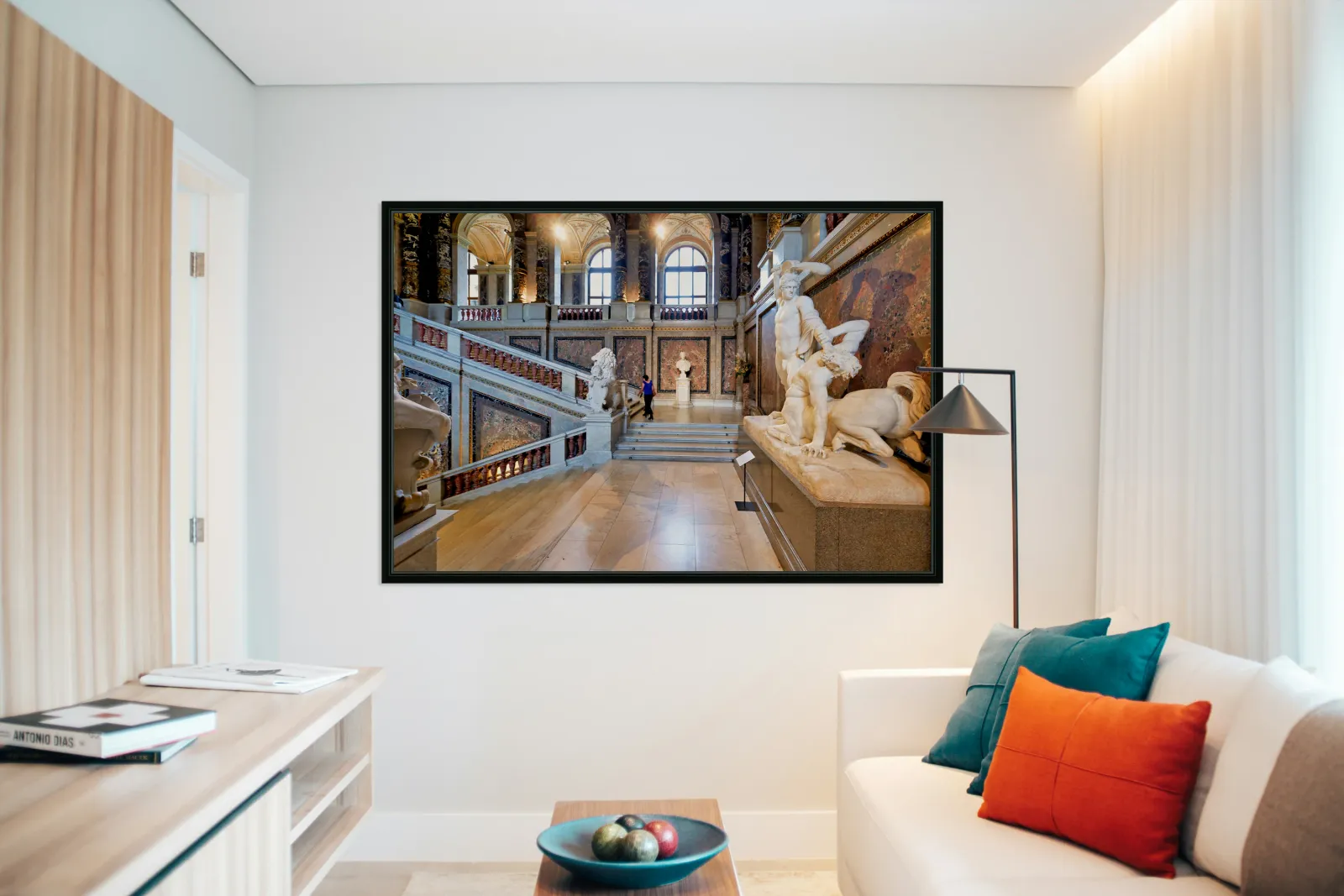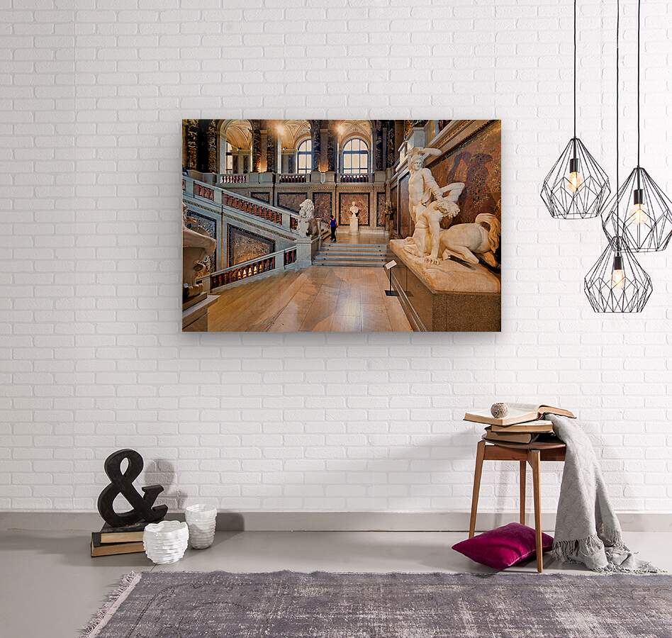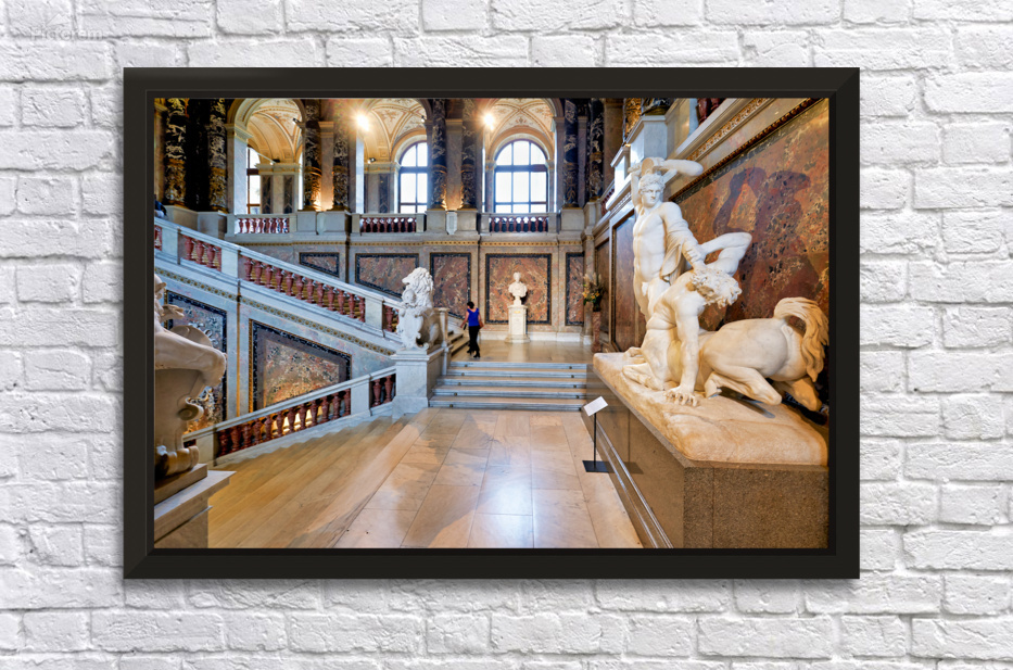 "Ornate museum hall with statues grand staircase and visitor." dans une impression encadrée.