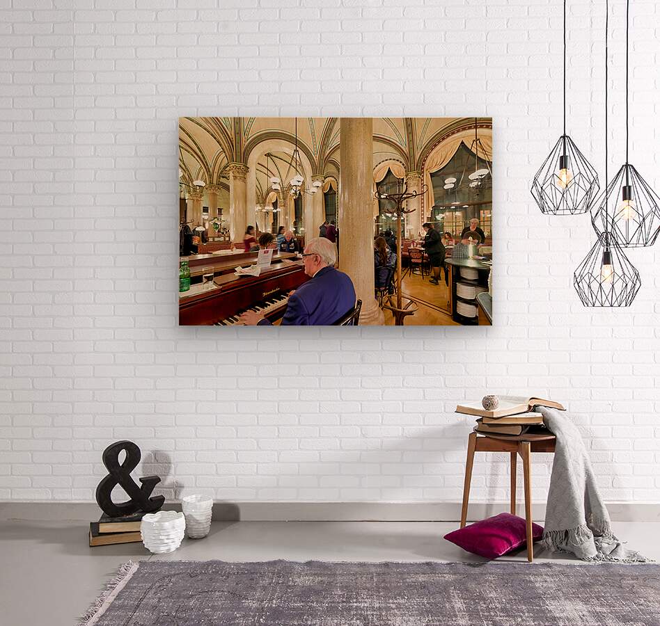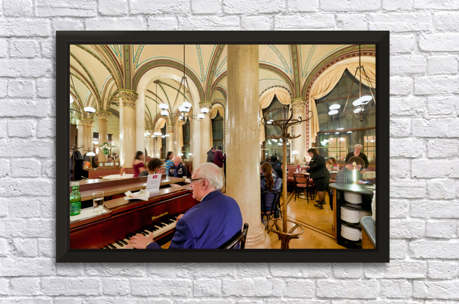 A pianist plays a Bösendorfer piano for diners in a grand ornate cafe likely in Vienna Austria providing a classic European ambiance.
