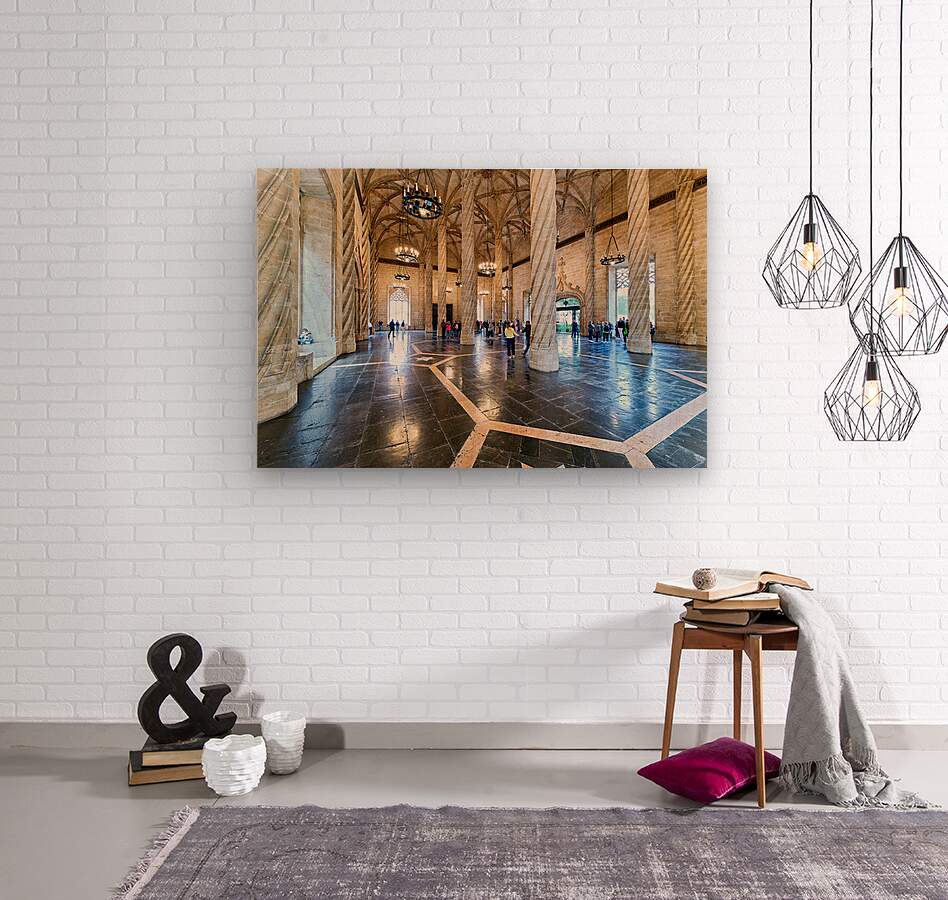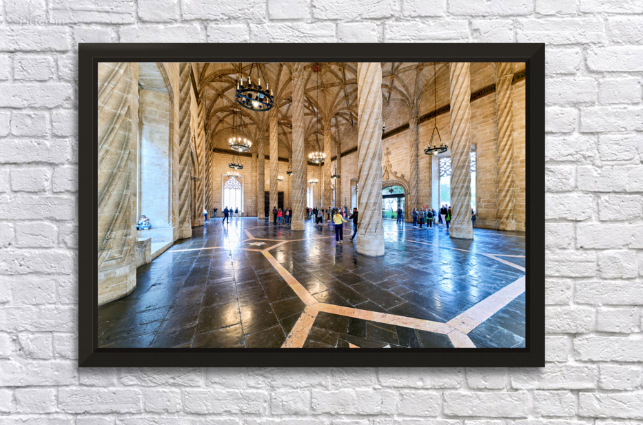 People walk around the large hall of Lonja de la Seda in Valencia. The tall columns and patterned floor attract many visitors.
